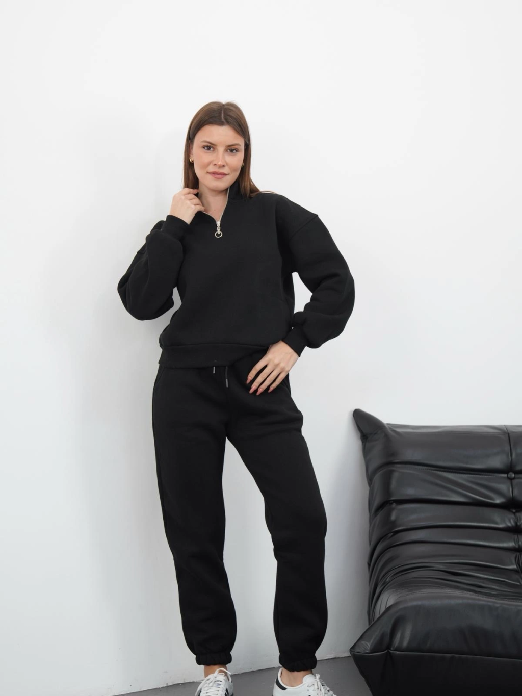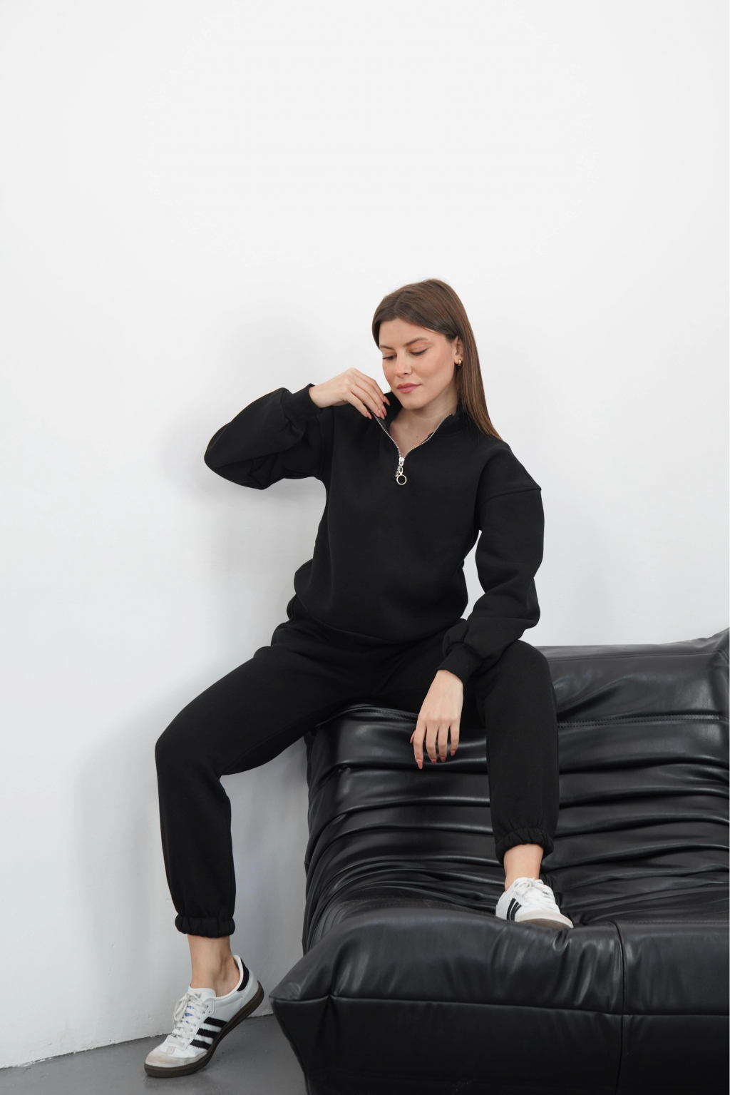 3 iplik içi Şardonlu yarım fermuarlı alt üst takım siyah