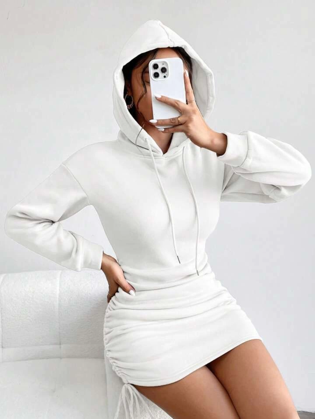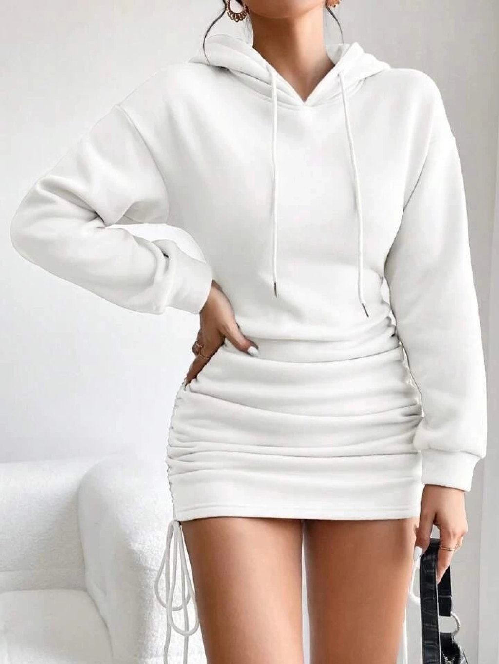 3 iplik şardonlu kapşonlu elbise beyaz