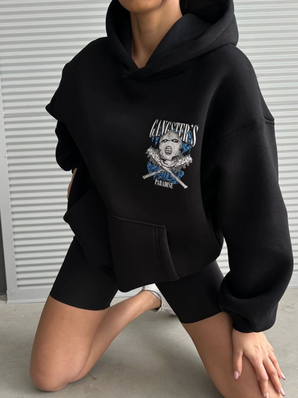 3 iplik şardonlu oversize kafa baskılı sweat siyah