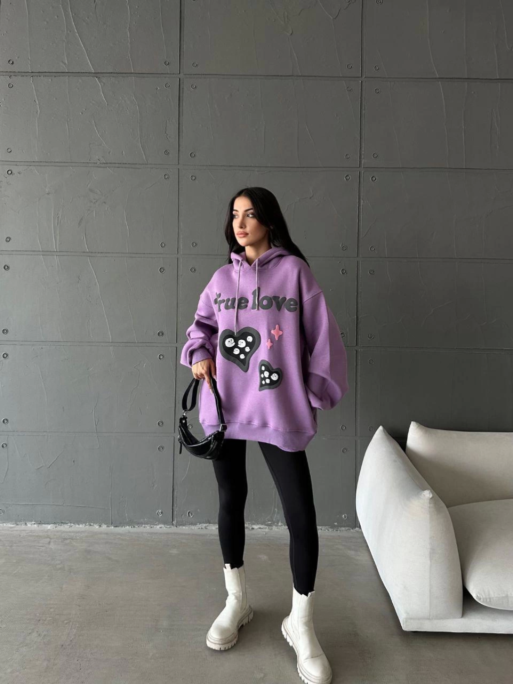 3 iplik şardonlu oversize true baskılı sweat mor