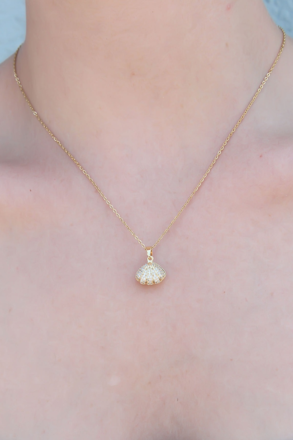 316L Çelik Zincir Altın Renk Zirkon Taşlı İnci Detay İstiridye Kolye
