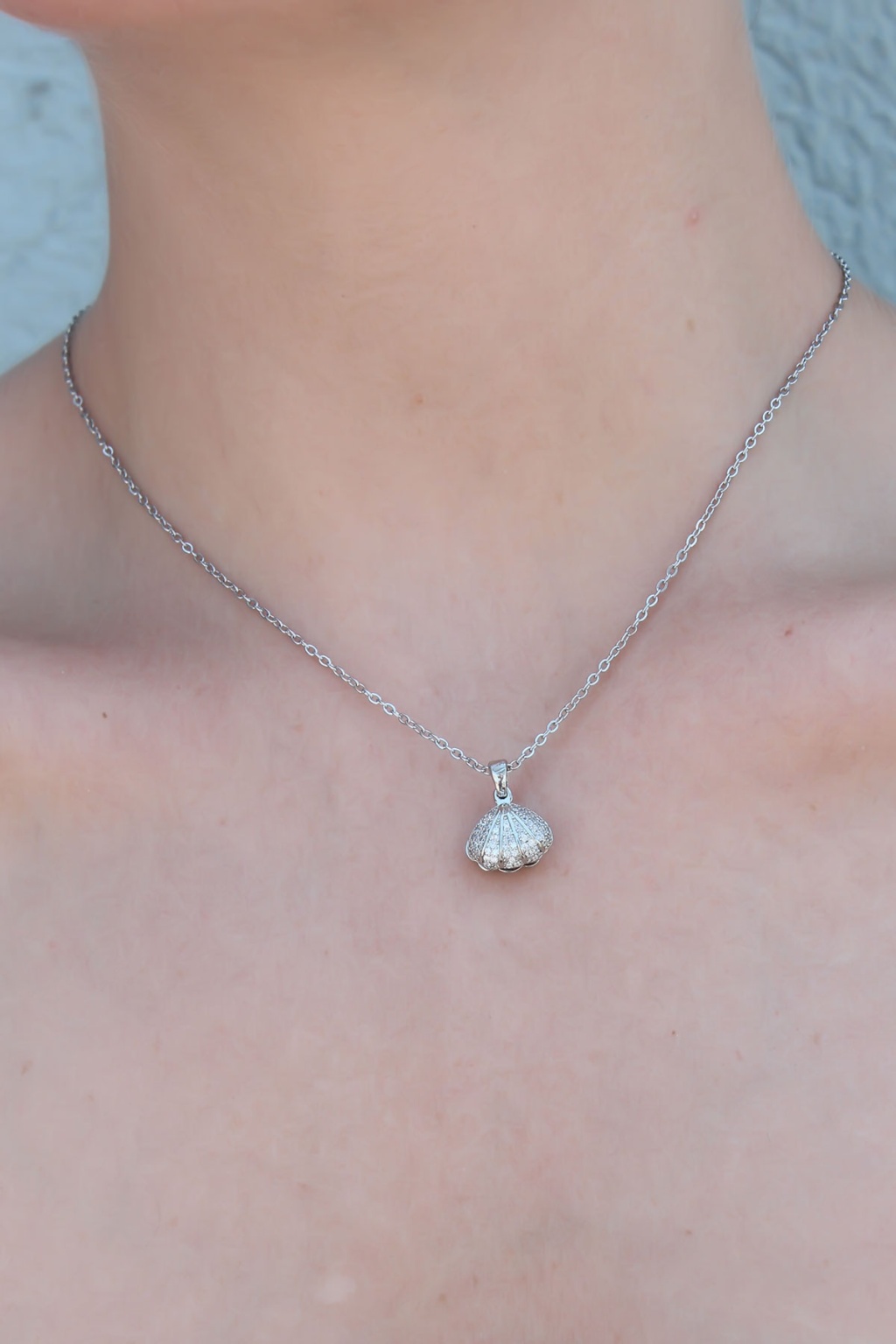 316L Çelik Zincir Gümüş Renk Zirkon Taşlı İnci Detay İstiridye Kolye