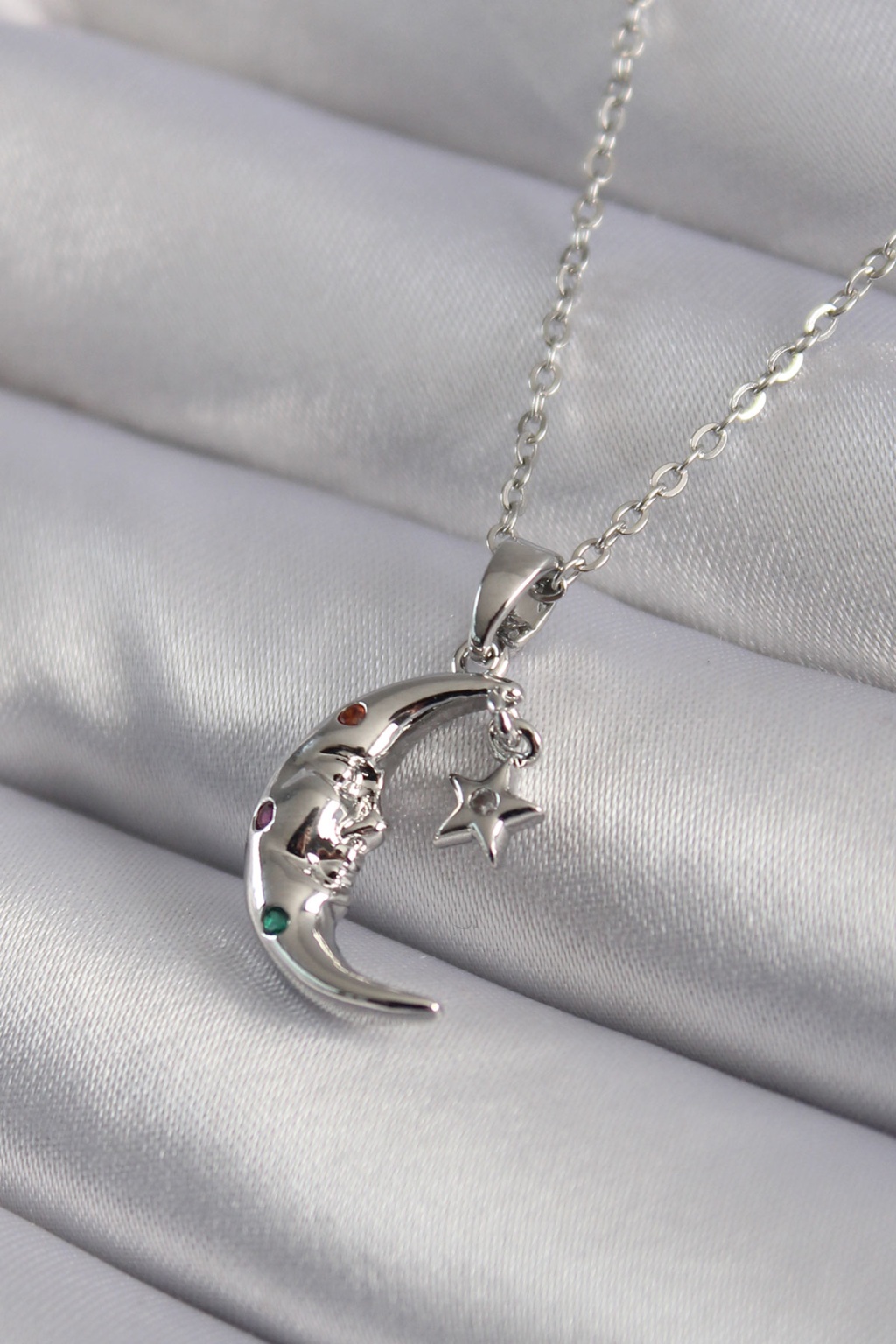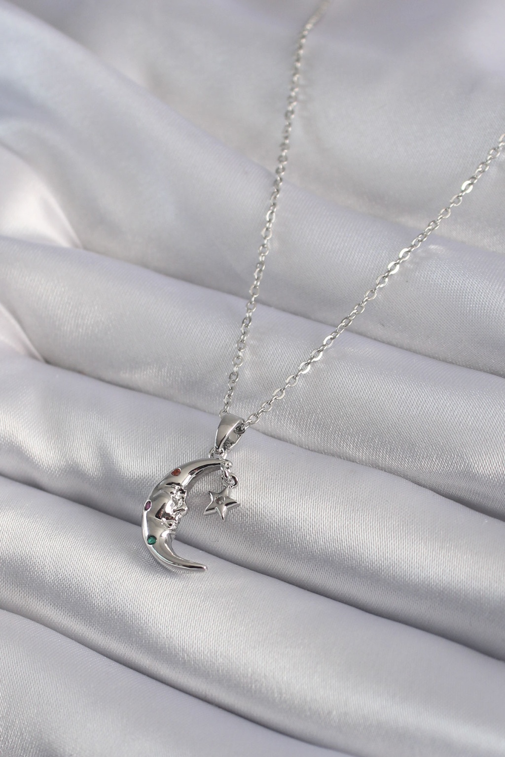 316L Çelik Gümüş Renk Zirkon Taşlı Ay Yıldız Model Kadın Kolye