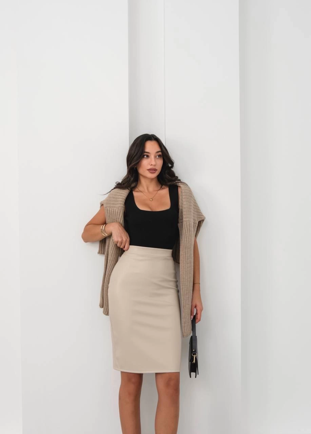 Cep detaylı oval kapaklı deri etek kahve h240048