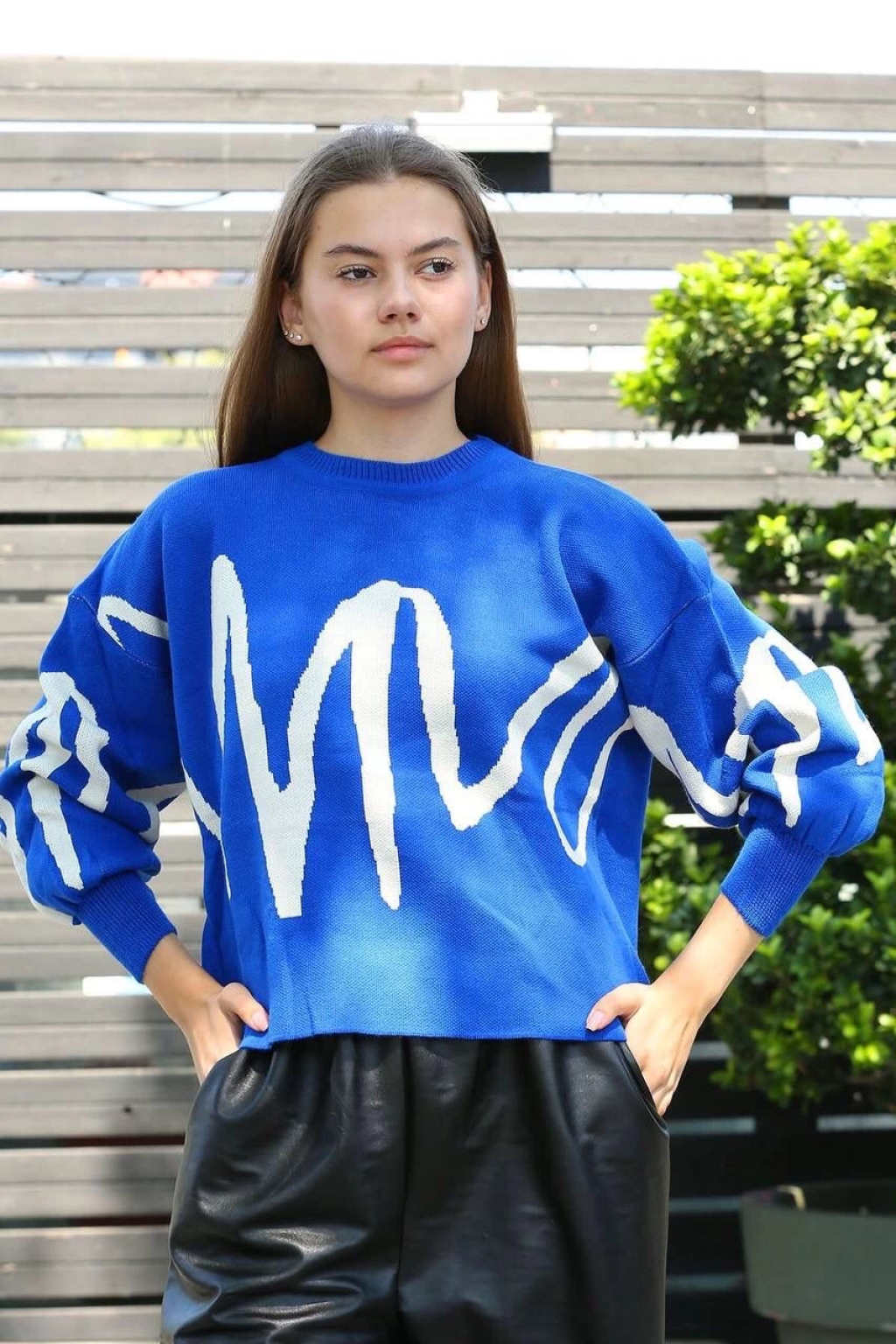 Beyaz çizgili bisiklet yaka kazak saksmavisi