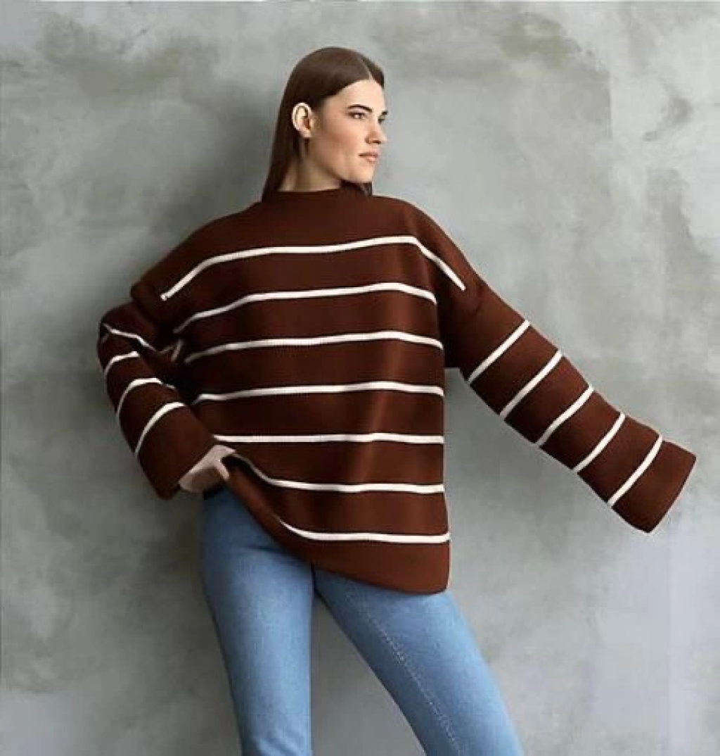 Çizgili ispanyol kol triko boğazlı kahve beyaz elf