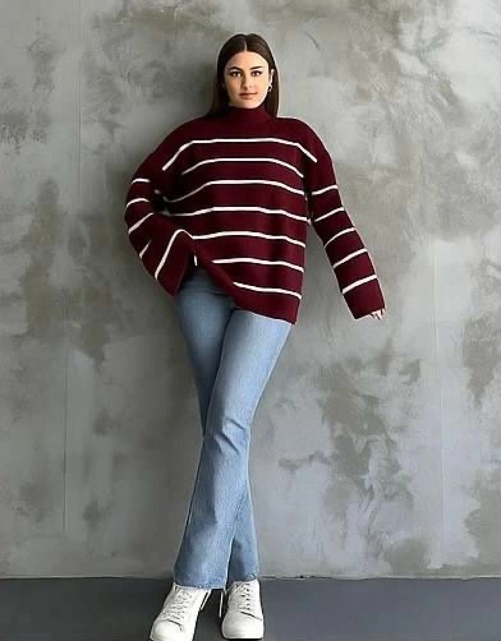 Çizgili ispanyol kol triko boğazlı kazak bordo elf