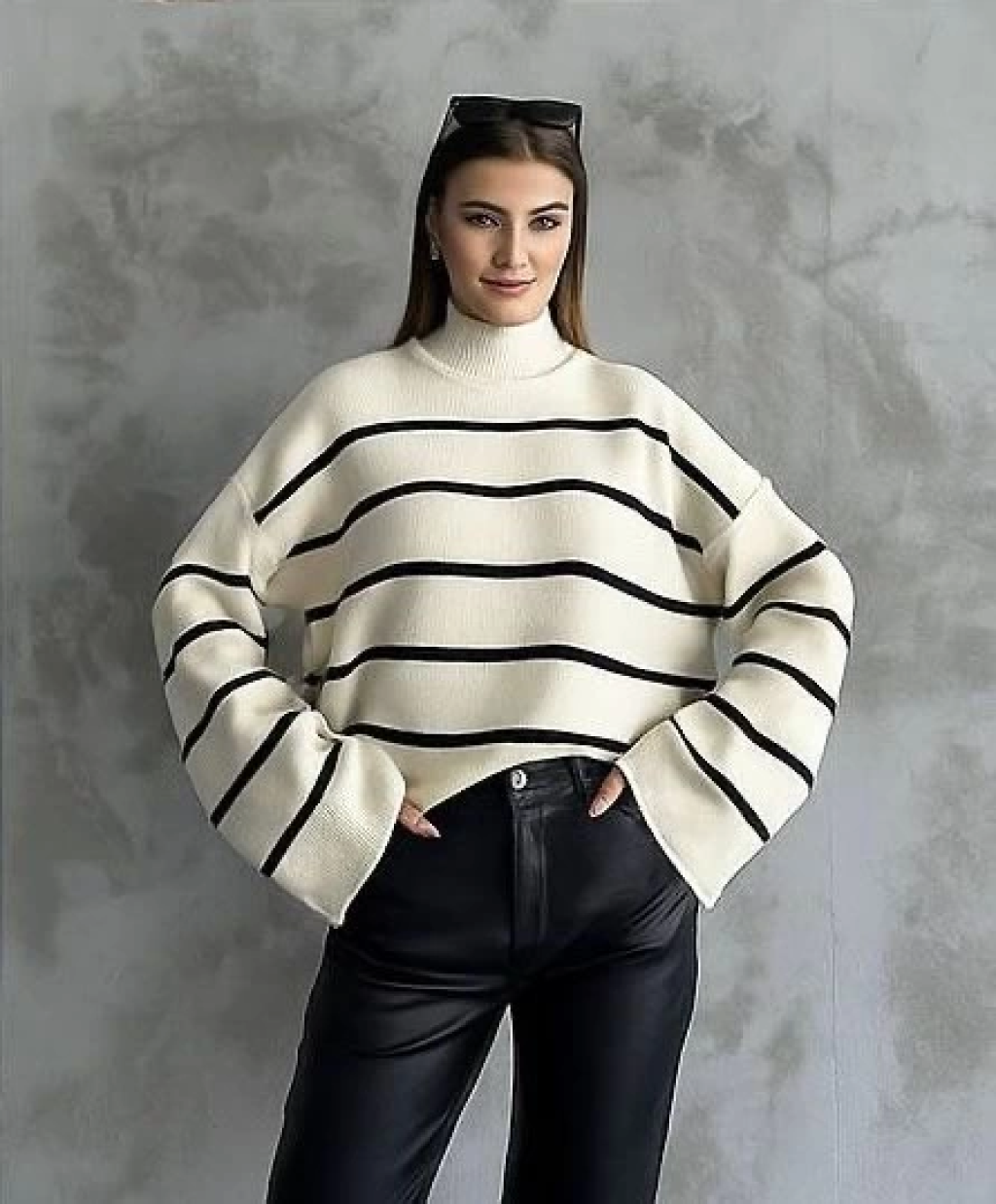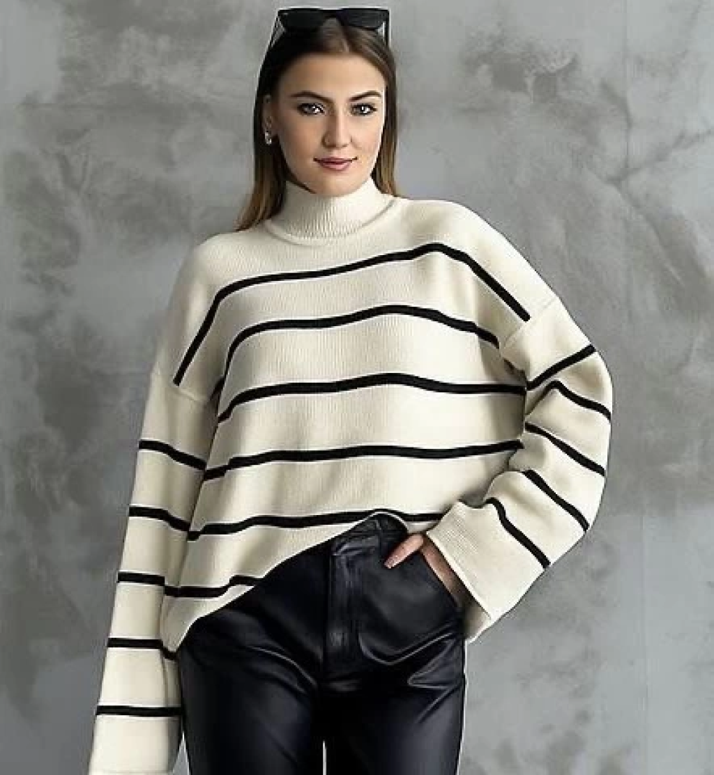 Çizgili ispanyol kol triko boğazlı kazak beyaz elf