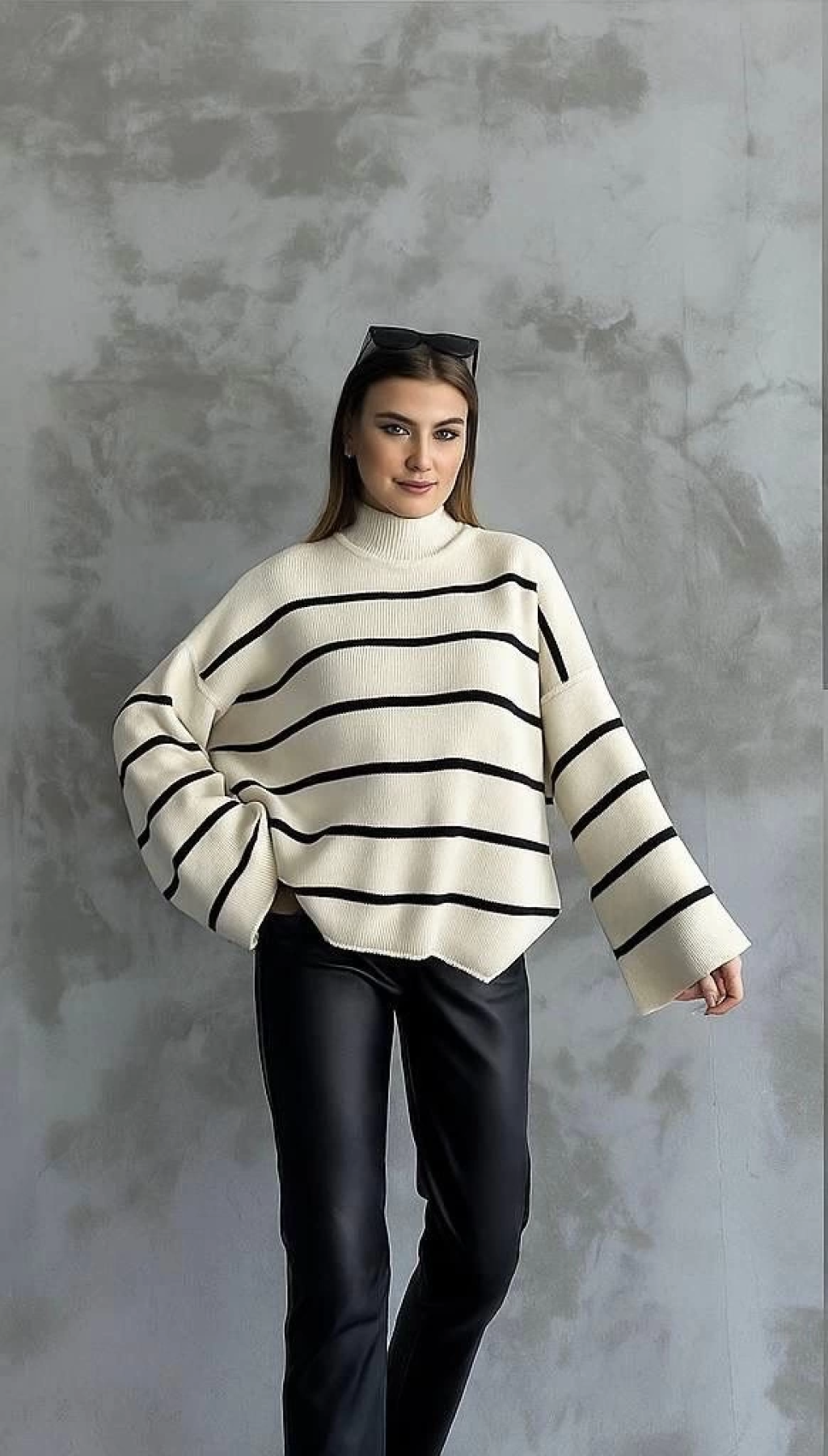 Çizgili ispanyol kol triko boğazlı kazak siyah elf
