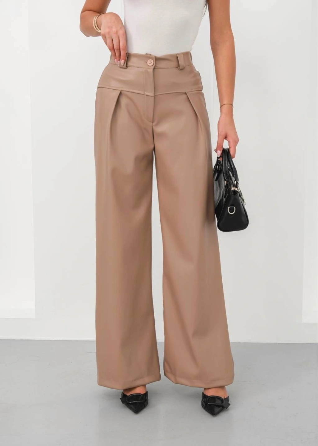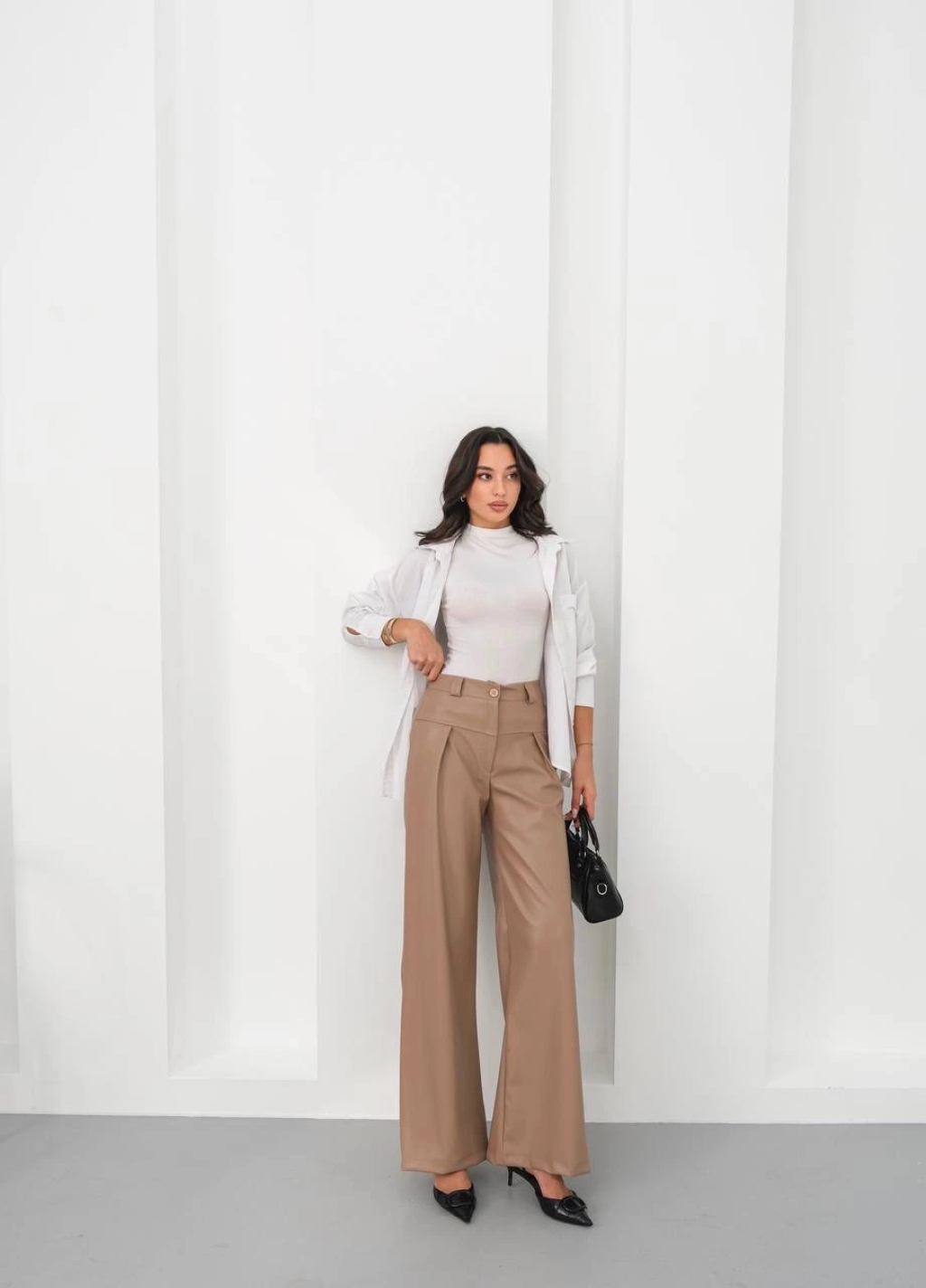 İspanyol yırtmaçlı paça deri pantolon bej hn