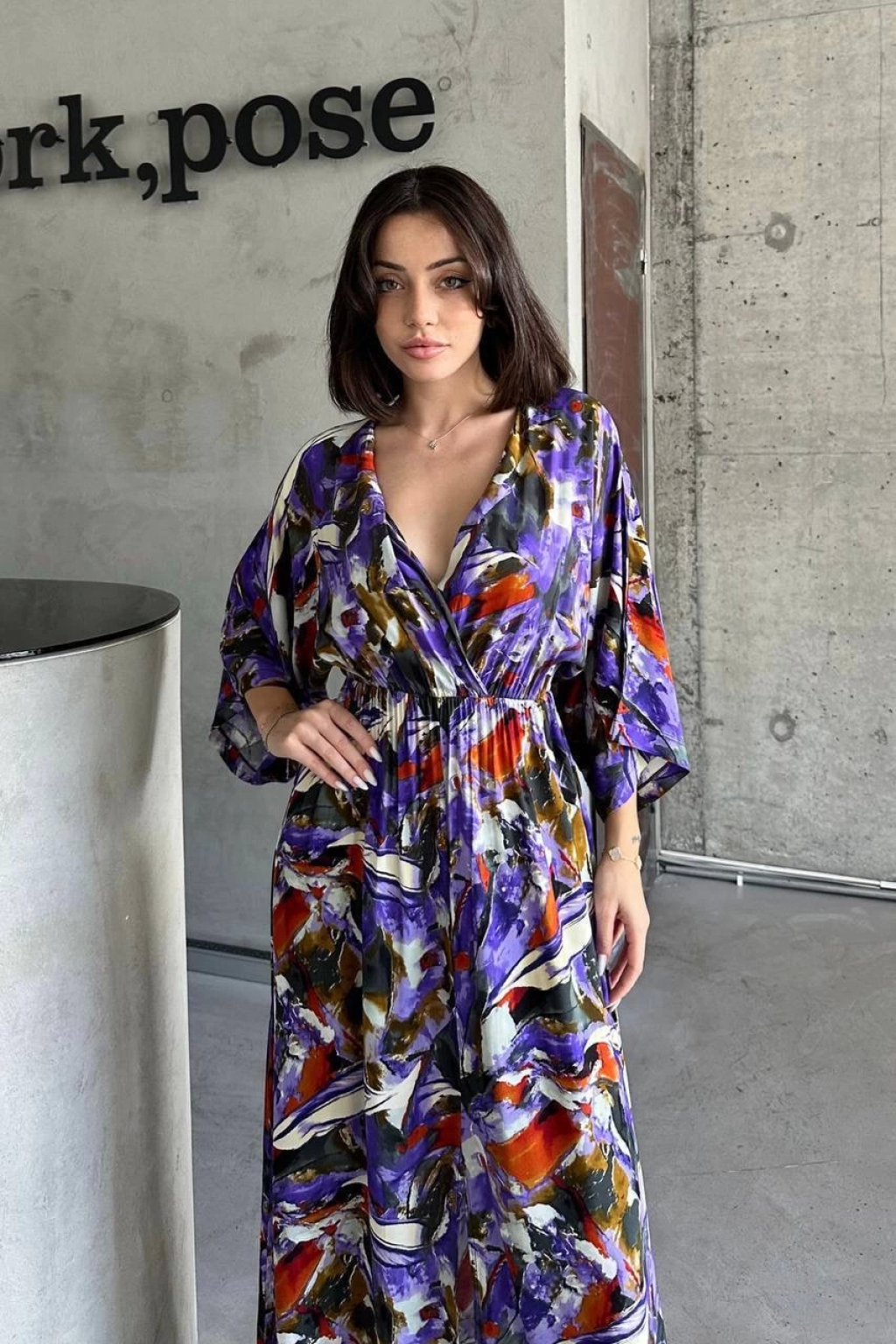 Dokuma baskılı yarasa kol elbise s8124