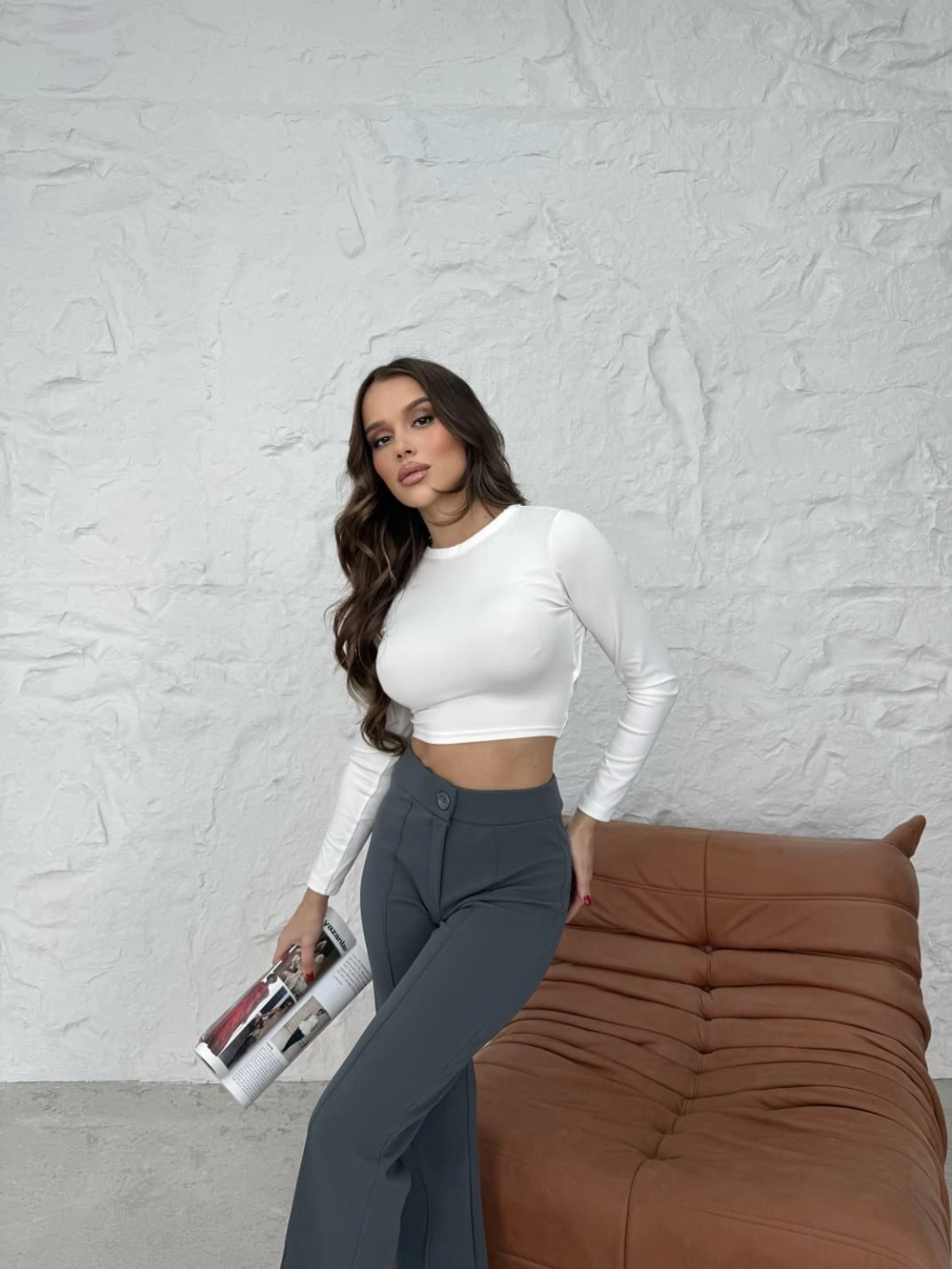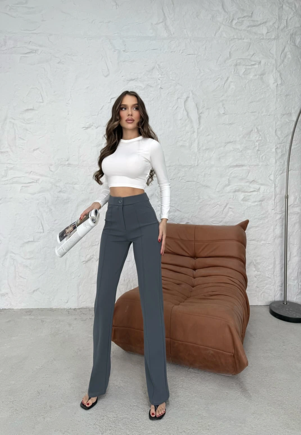 3 iplik şardonlu palazzo pantolon füme md64