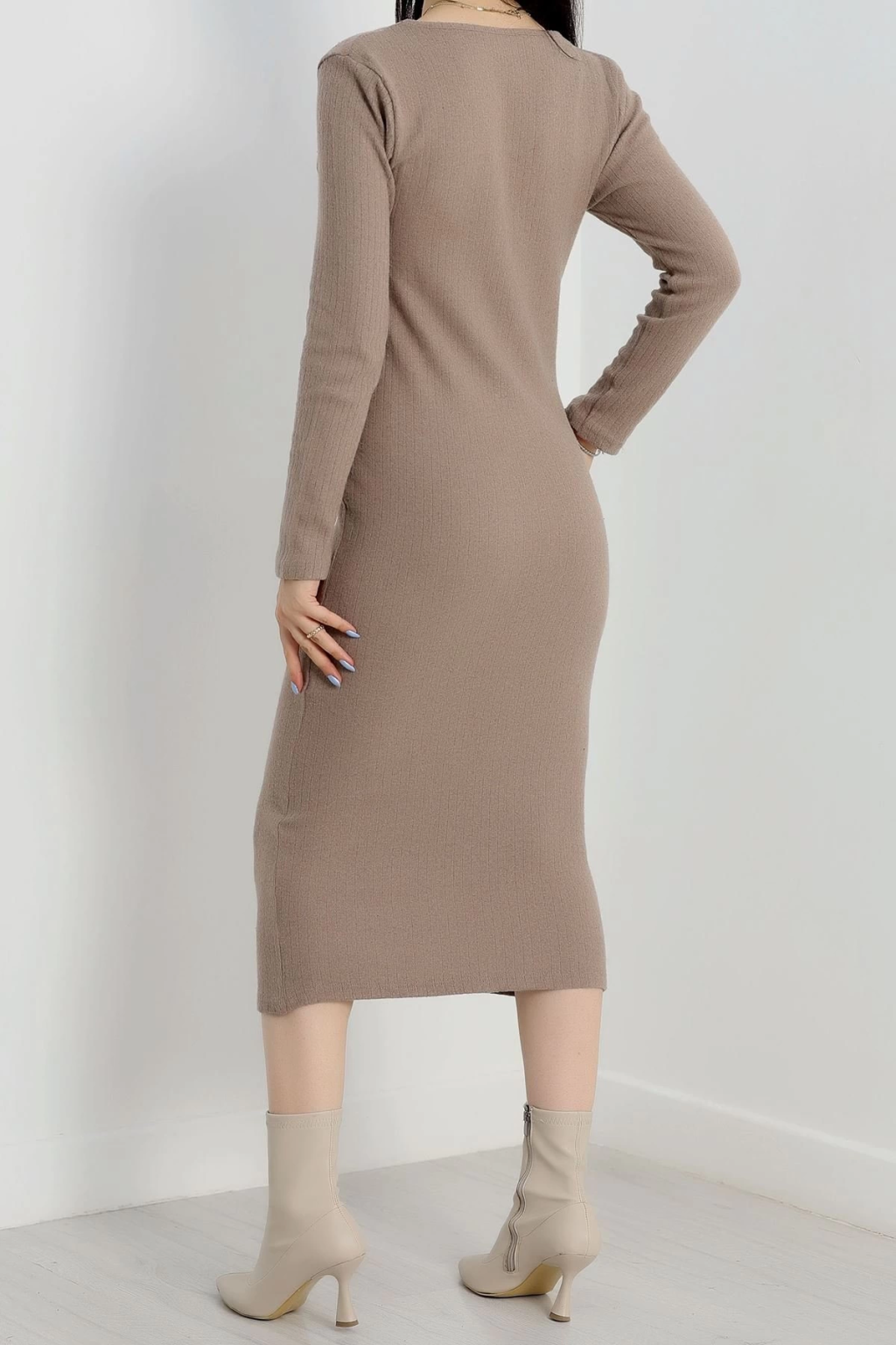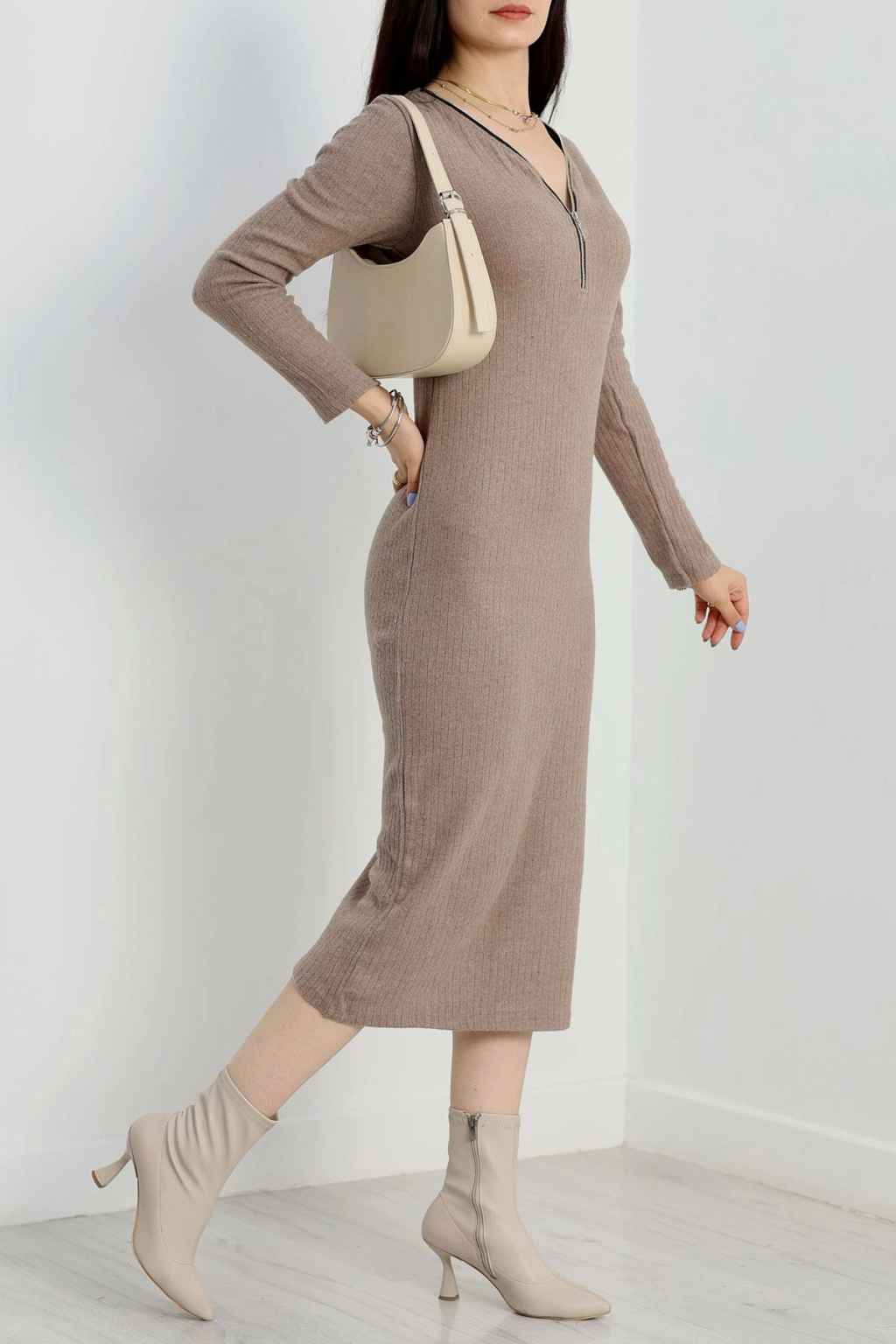 Fermuar detaylı fitilli şardonlu elbise bej a3178