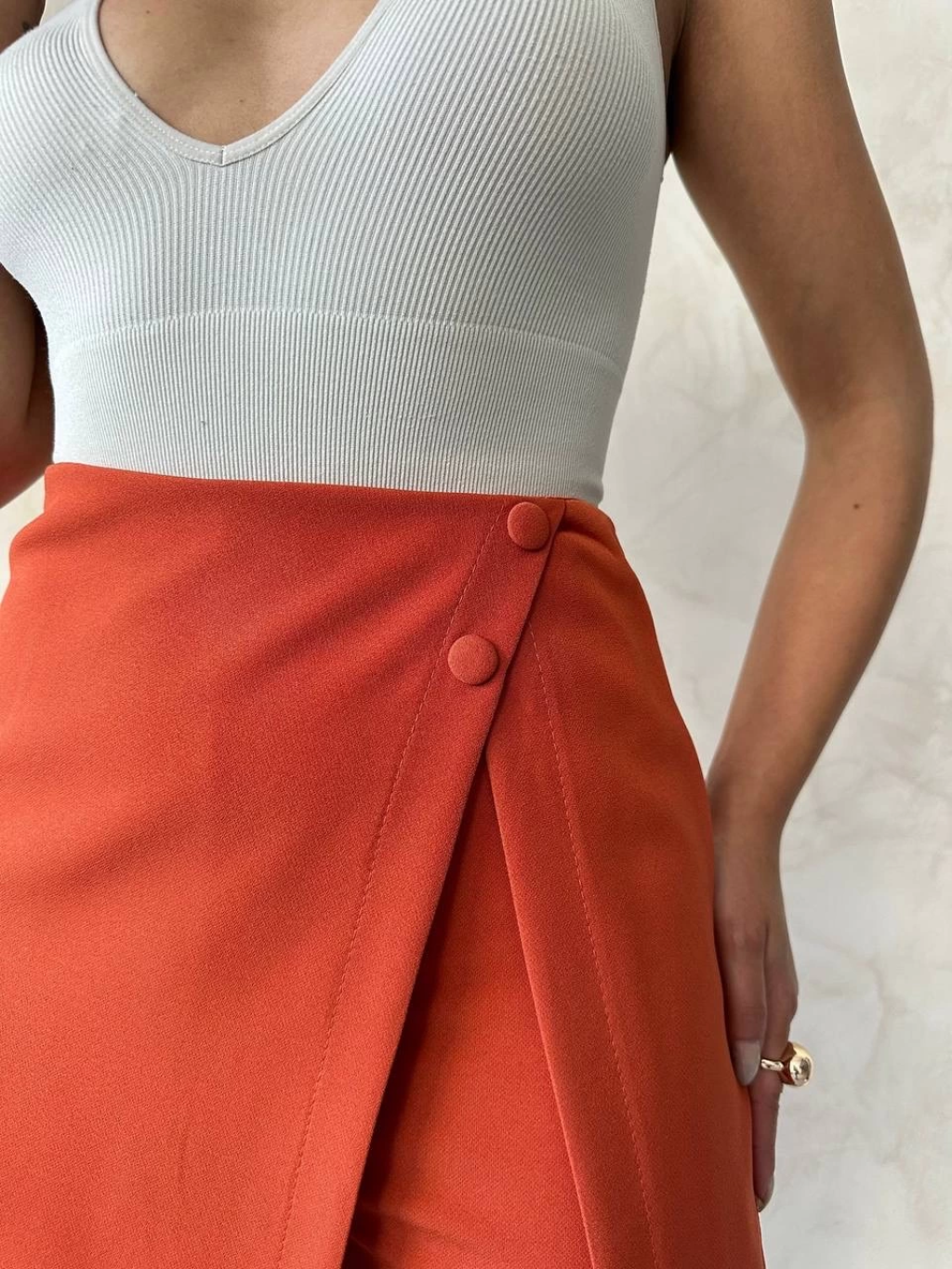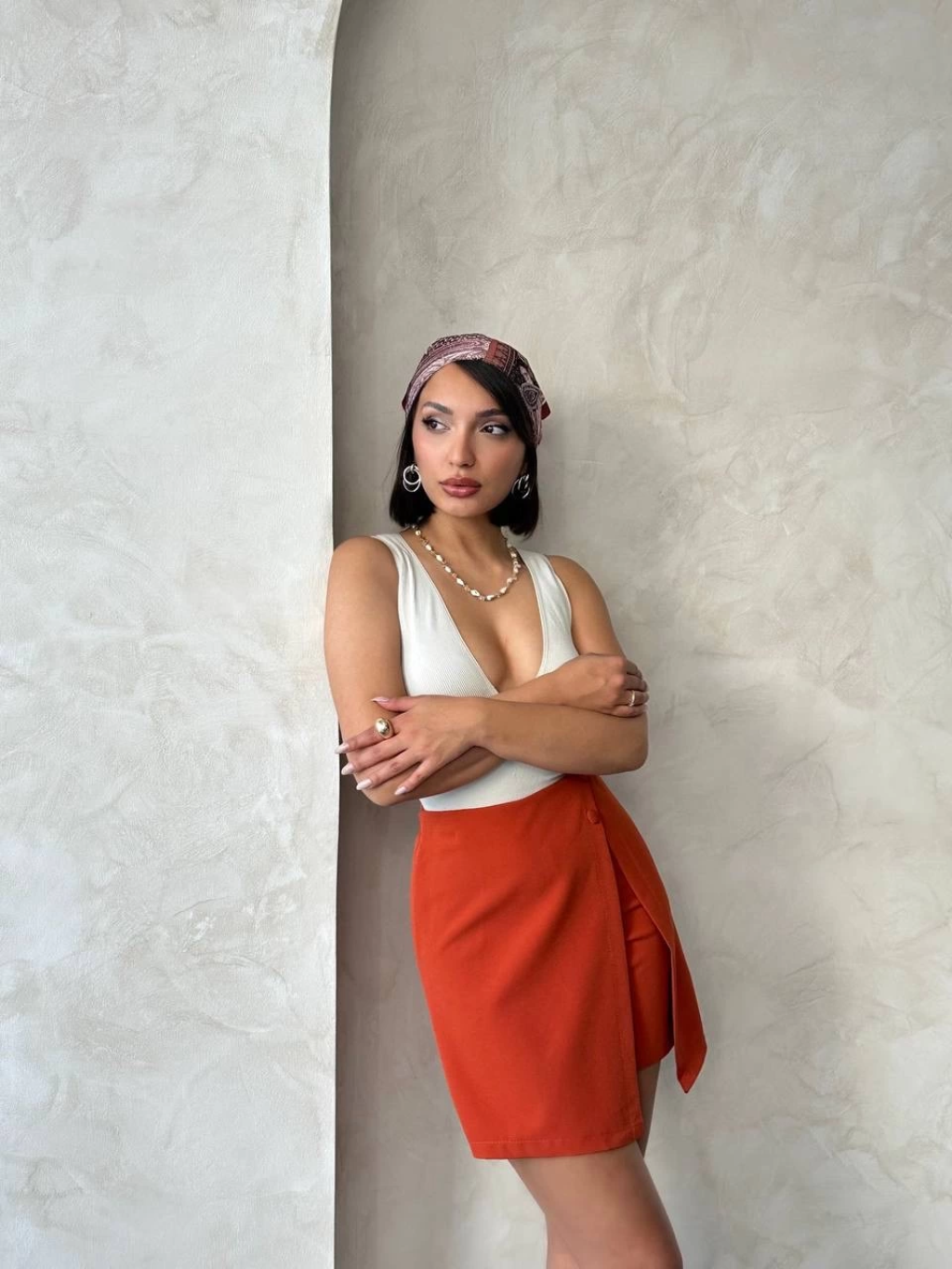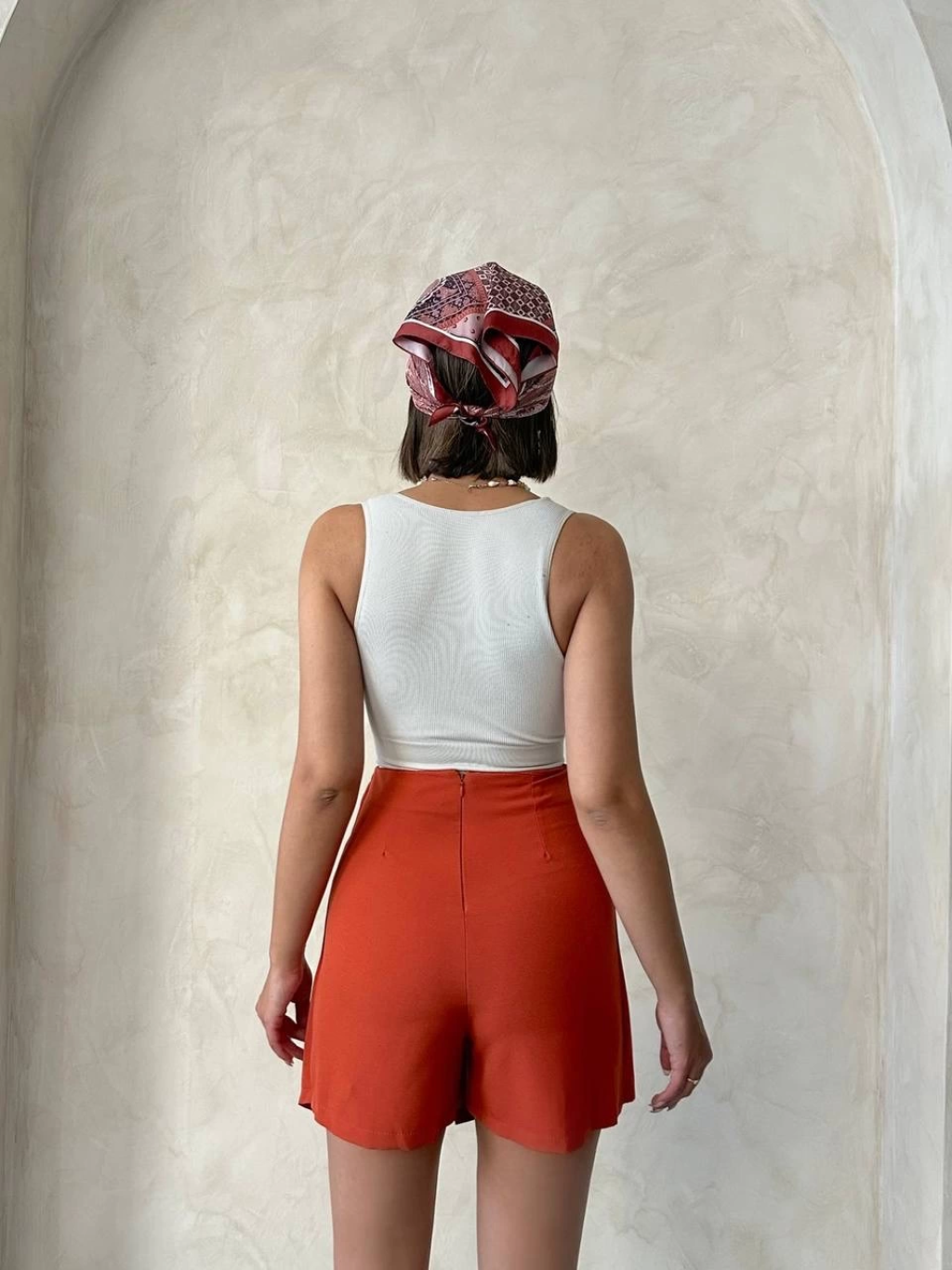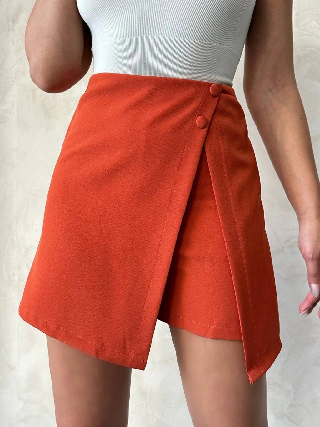 İki düğmeli kaz ayağı desen ch kumaş şort etek beyazturuncu h26414