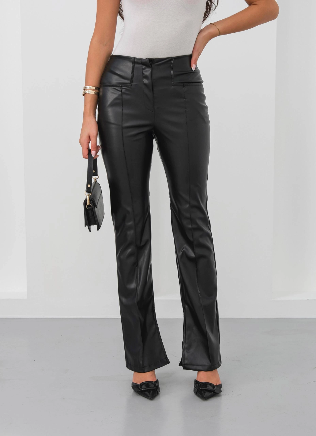 İspanyol yırtmaçlı paça deri pantolon bej hn