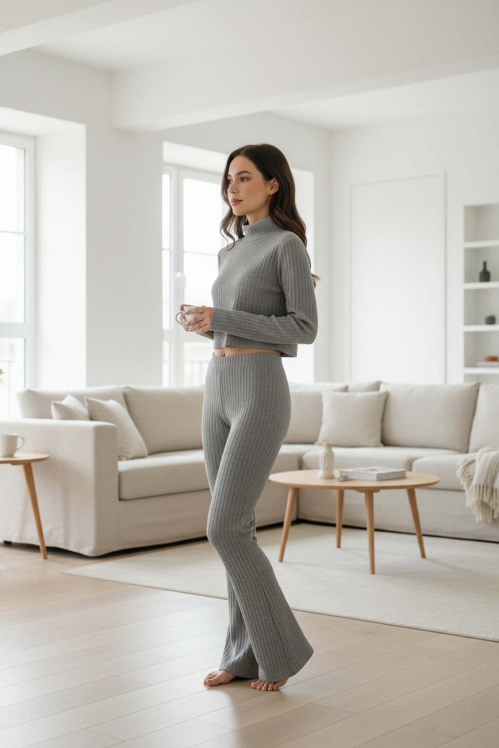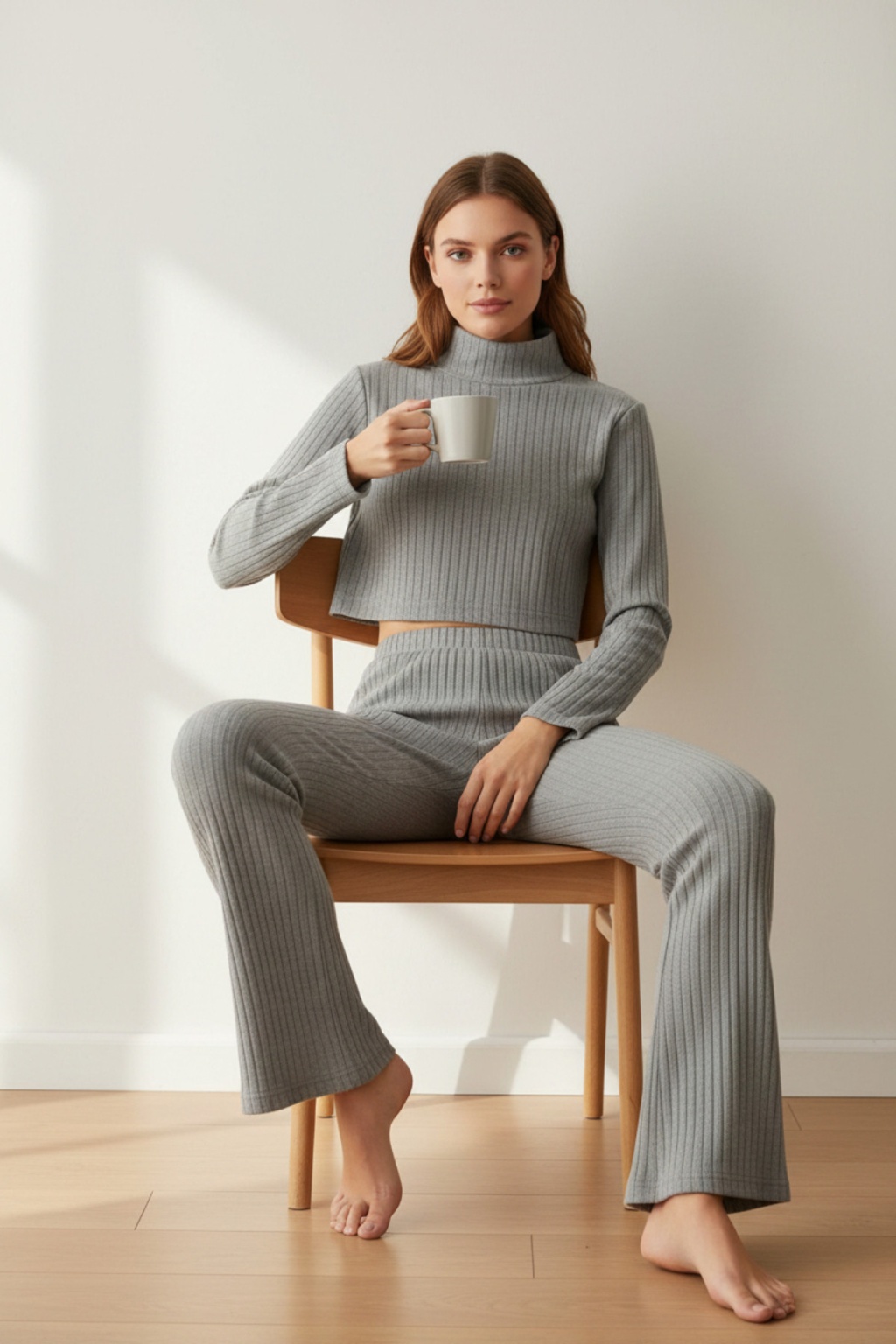 Kadın Fitilli Eşofman Takımı – Gri Boğazlı Crop Üst & İspanyol Paça Pantolon, Esnek Rahat Kalıp