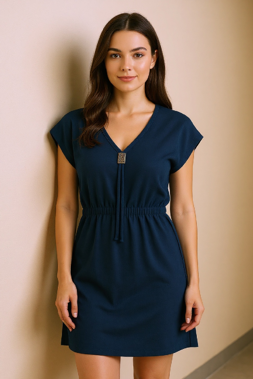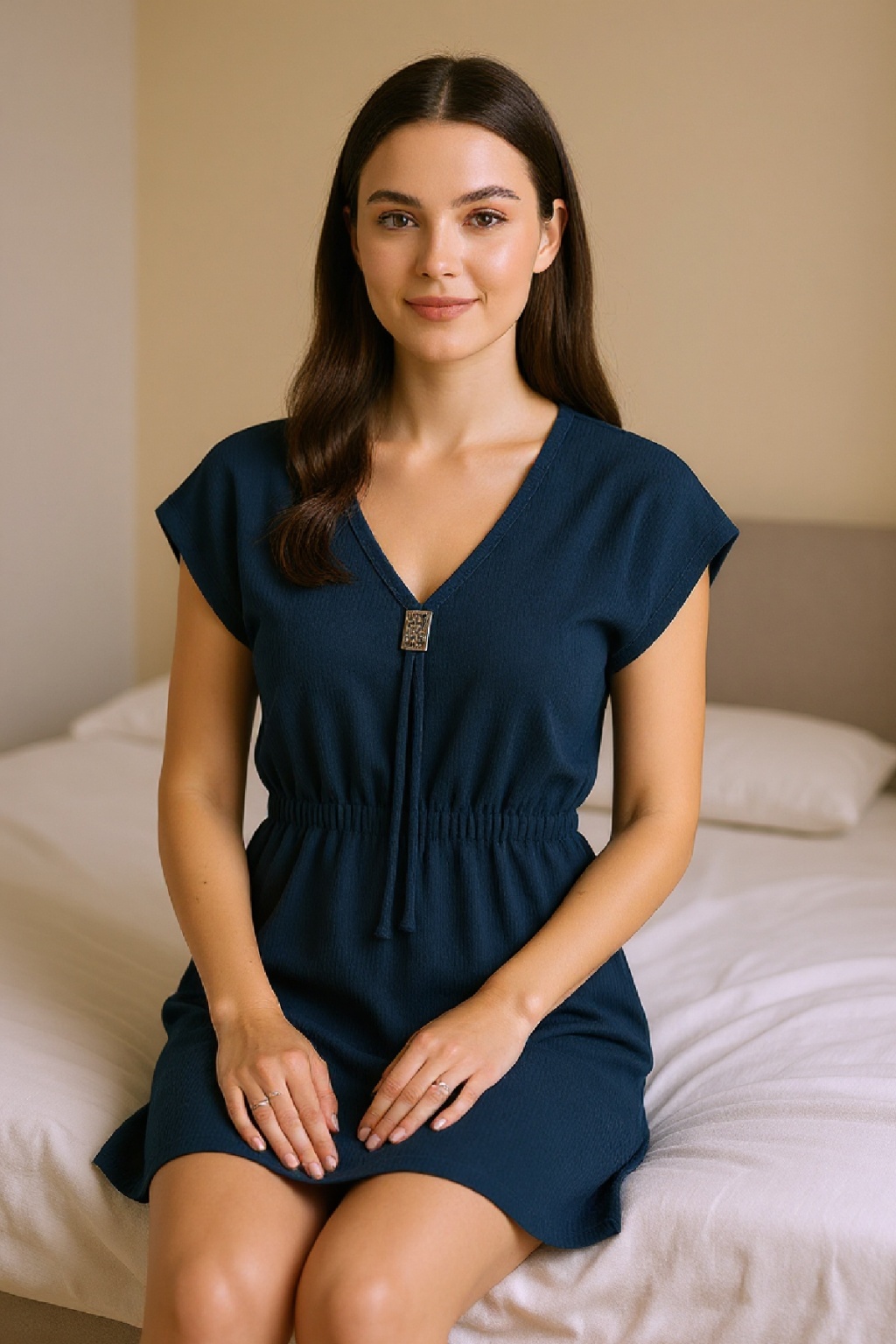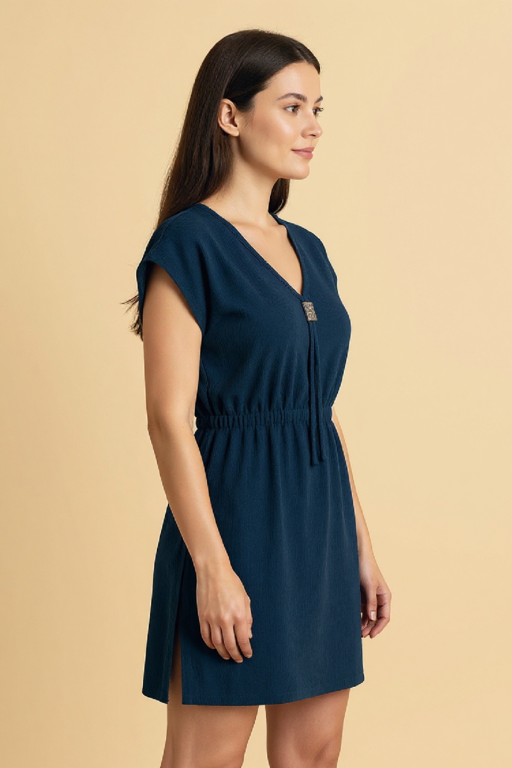 Kadın Lacivert Yanları Yırtmaçlı Tokalı V Yaka Mini Plaj Elbisesi