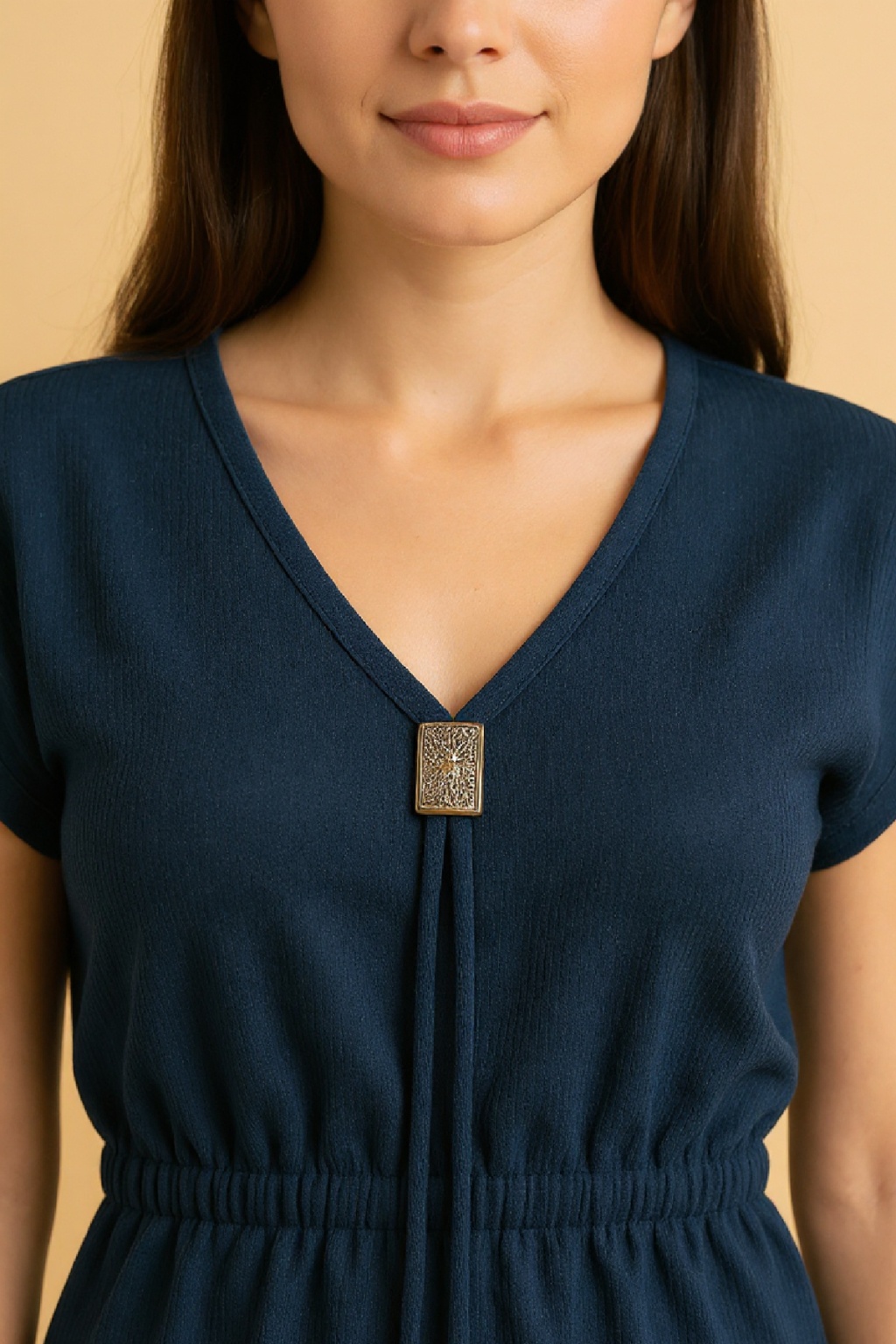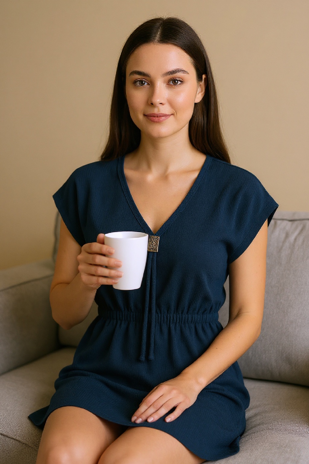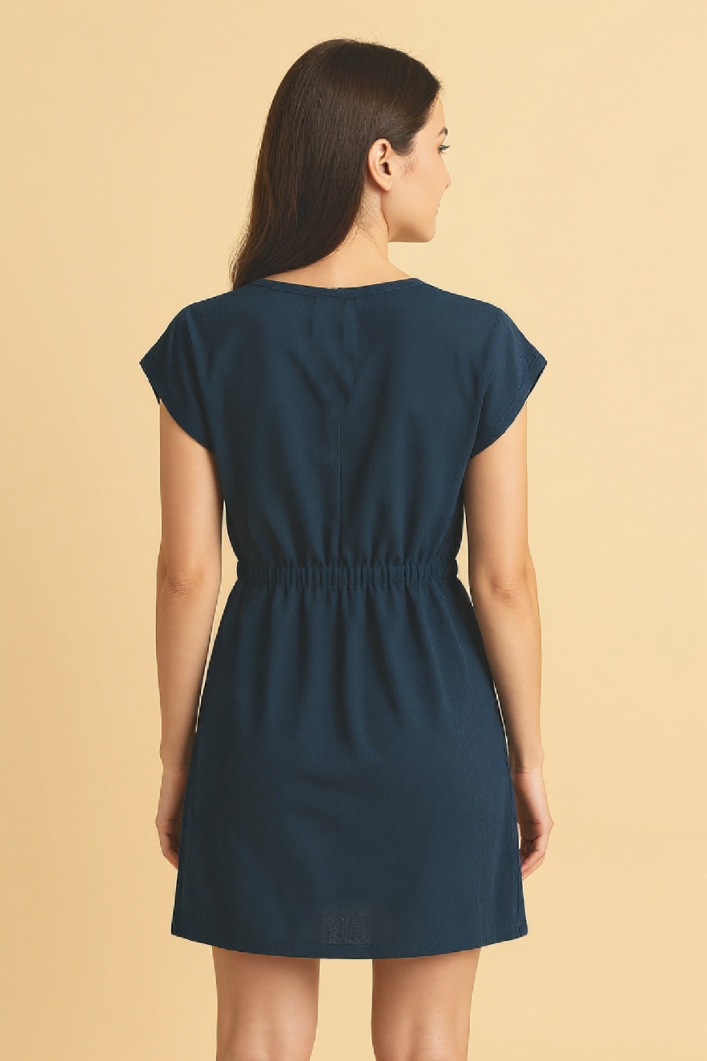 Kadın Lacivert Yanları Yırtmaçlı Tokalı V Yaka Mini Plaj Elbisesi