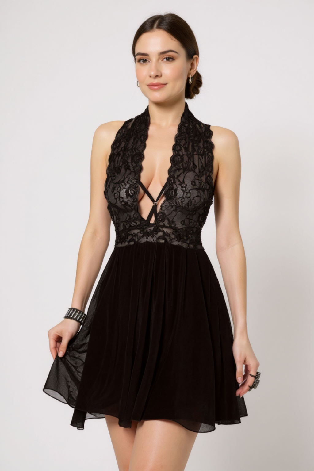 Kadın Siyah Çapraz Bağlı Kısa Tül Dantel Gecelik – Modern ve Şık Tasarım