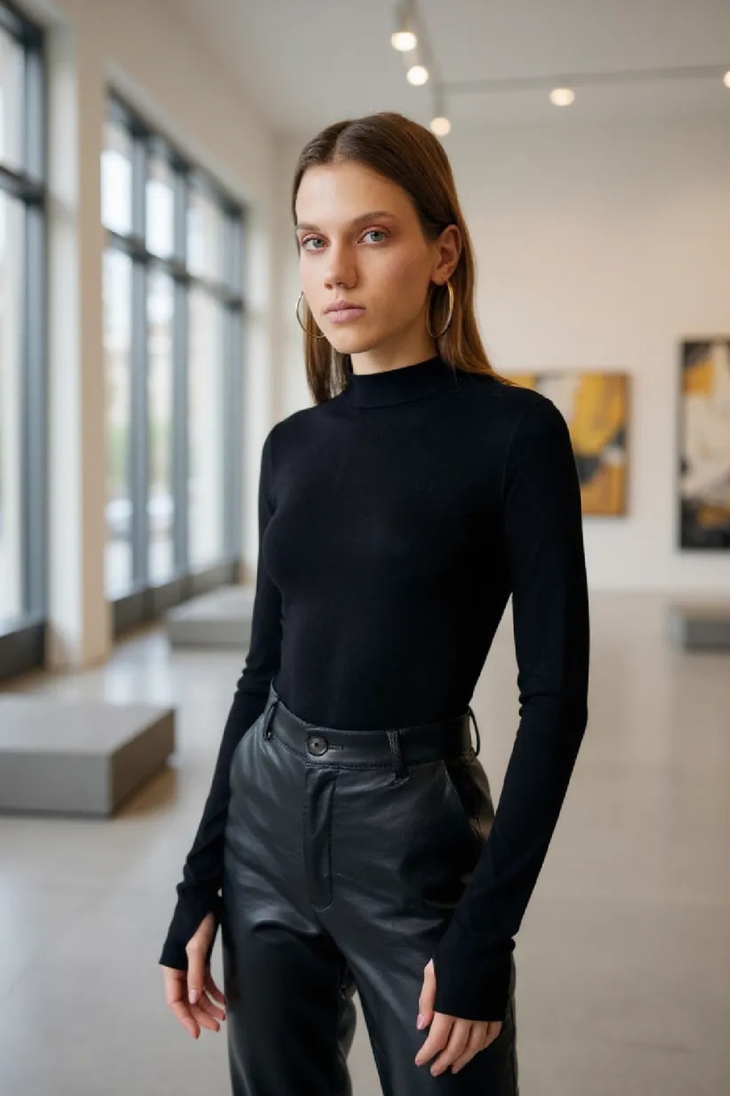 Kadın Siyah Parmak Detaylı Esnek Uzun Kollu Body