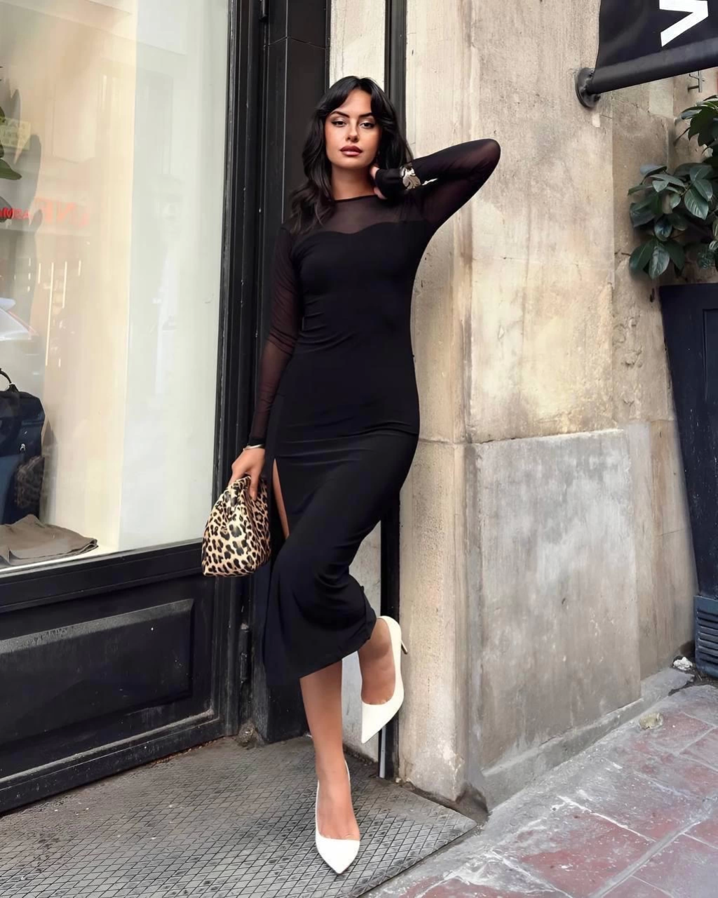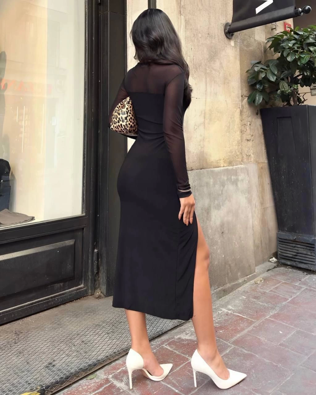 Kadın tül detaylı midi boy yırtmaçlı elbise