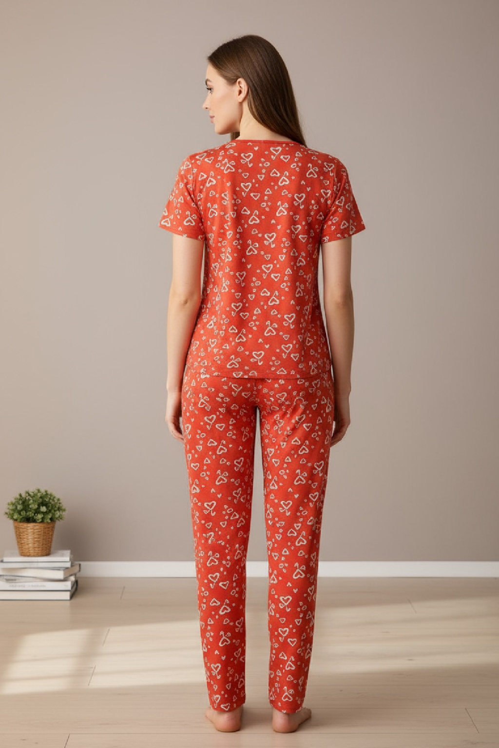Kadın Turuncu Kalp Desenli Fiyonklu Kısa Kollu Uzun Pijama Takımı