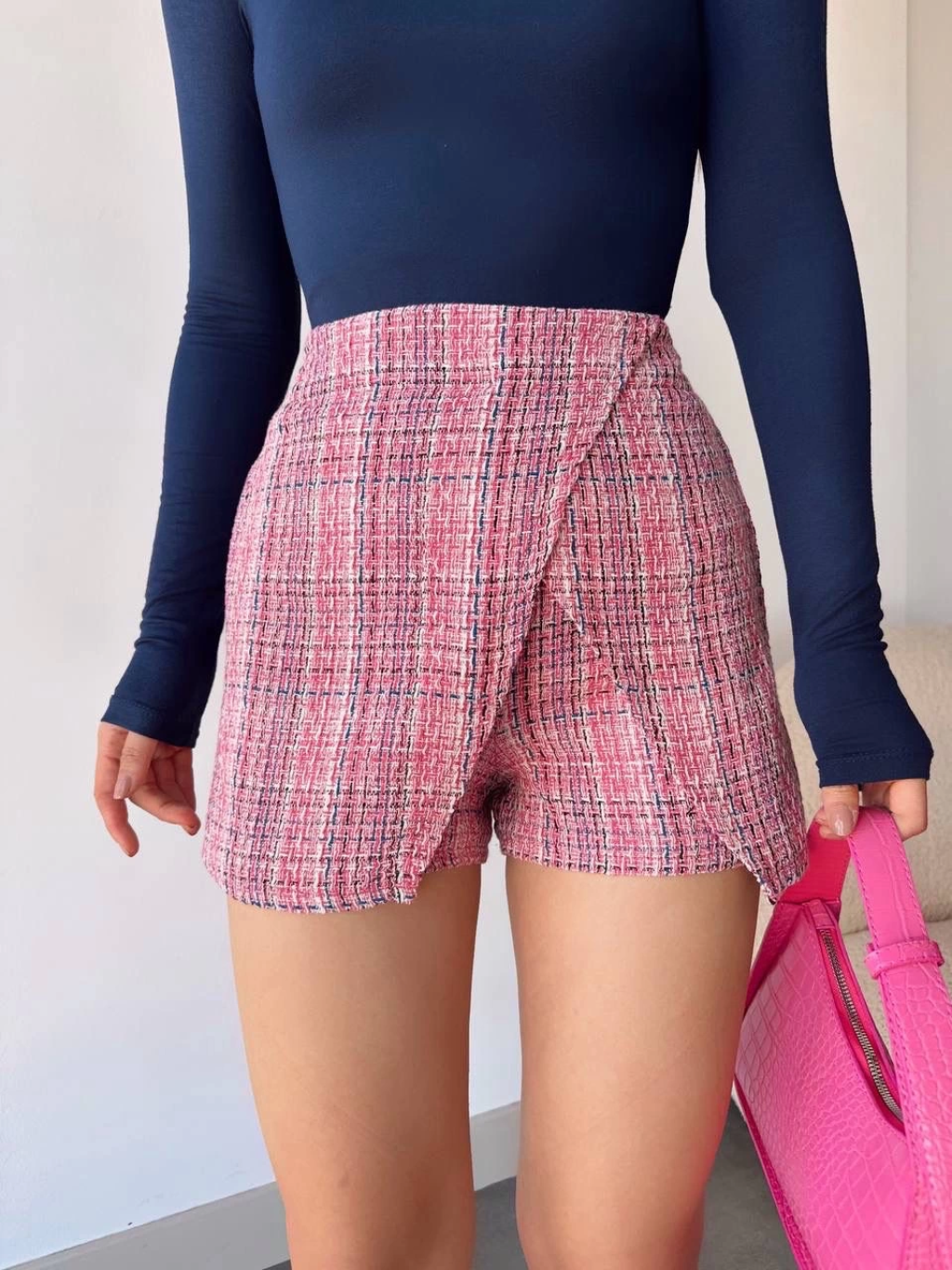 İki düğmeli kaz ayağı desen ch kumaş şort etek beyazturuncu h26414