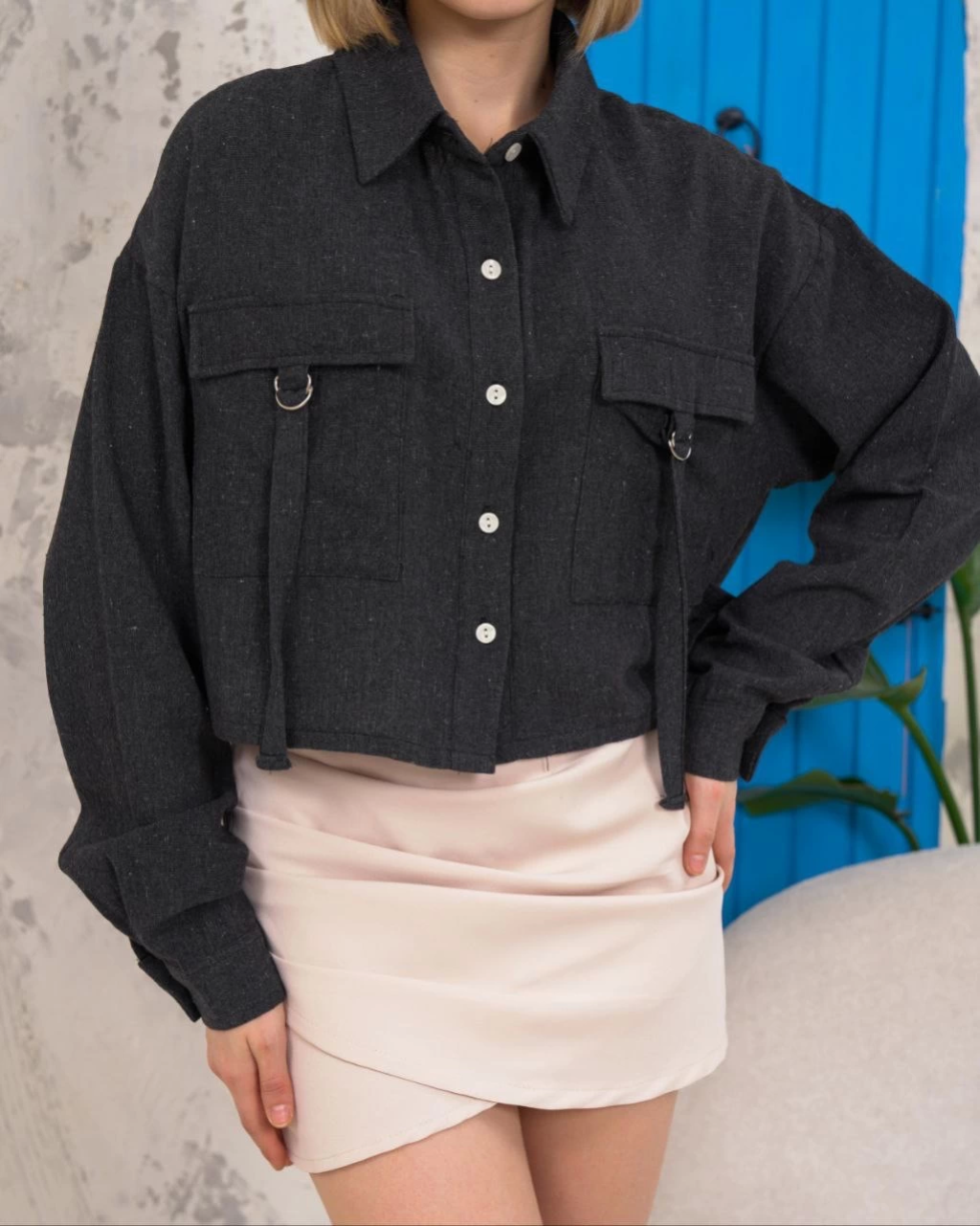 Sıfır kollu bağlamalı crop gömlek siyah s255359