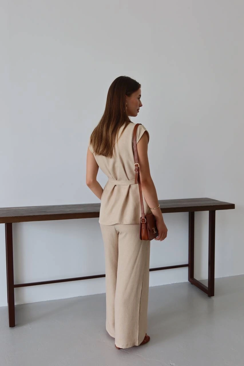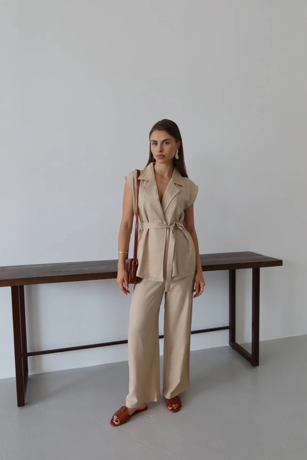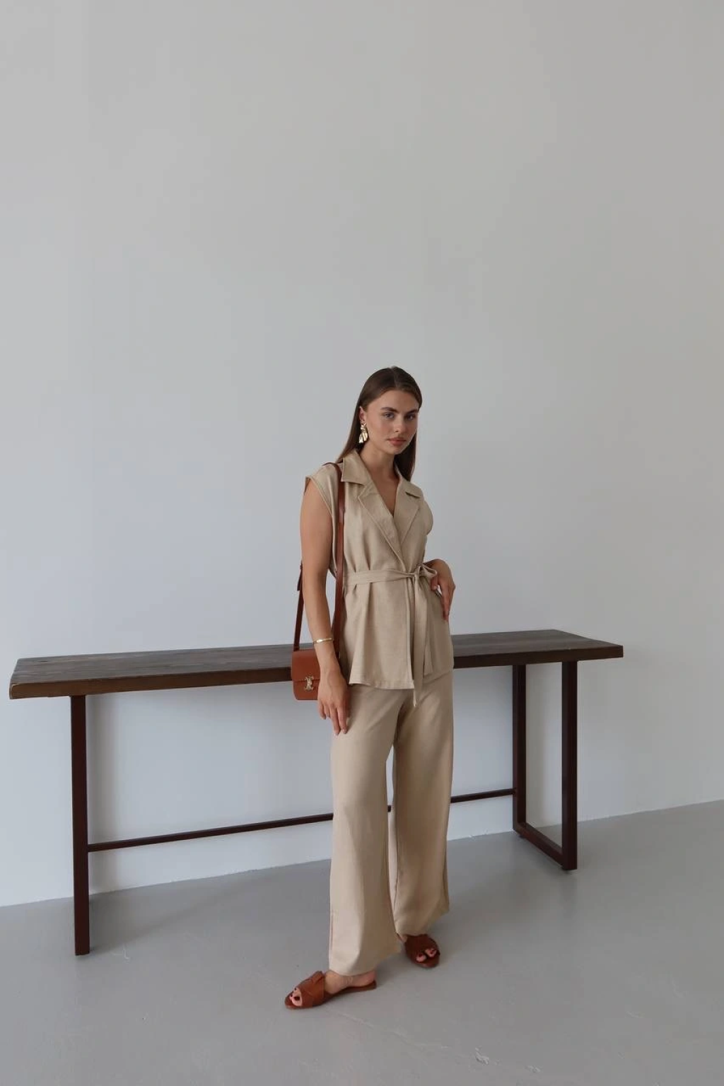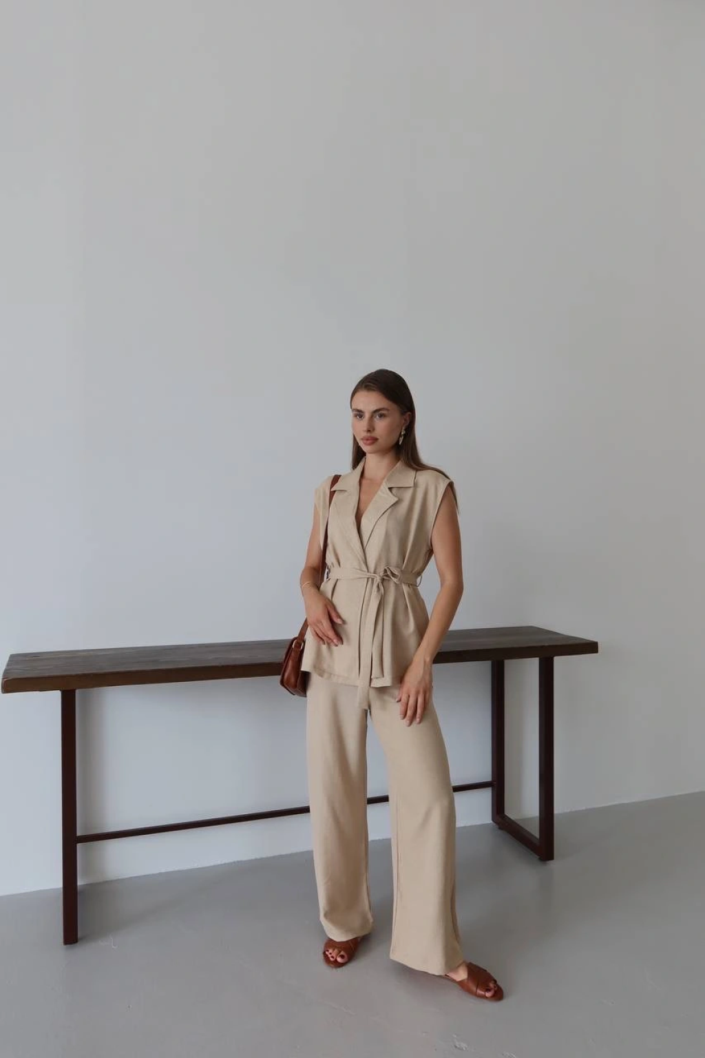 Keten yelek pantolon takım bej pt