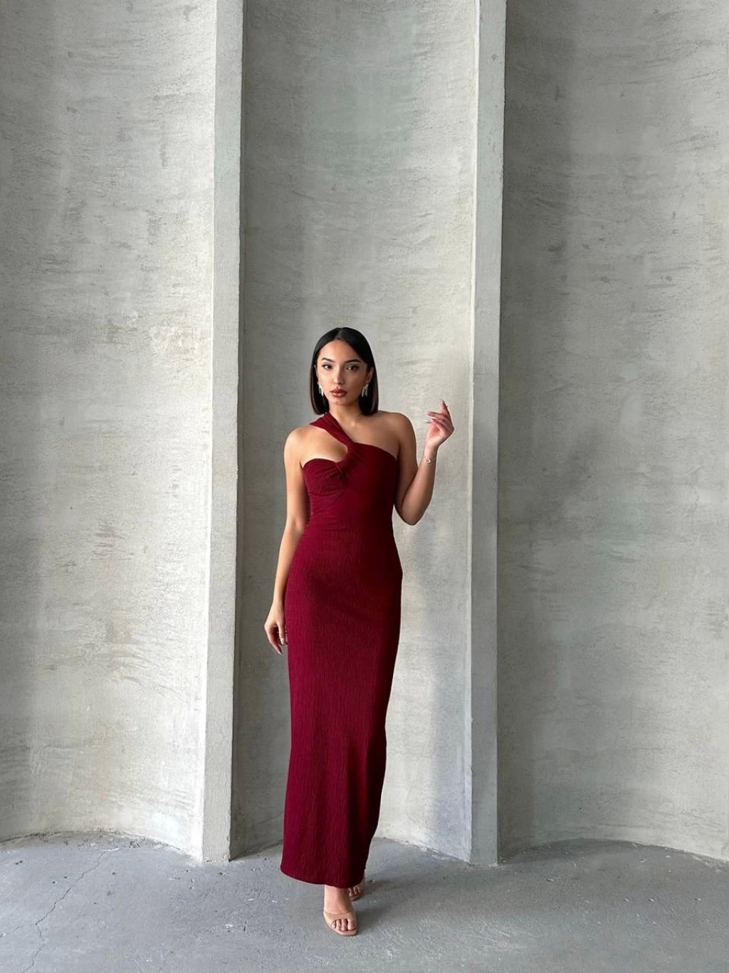 Madonna yaka midi yırtmaçlı kuşaklı keten elbise