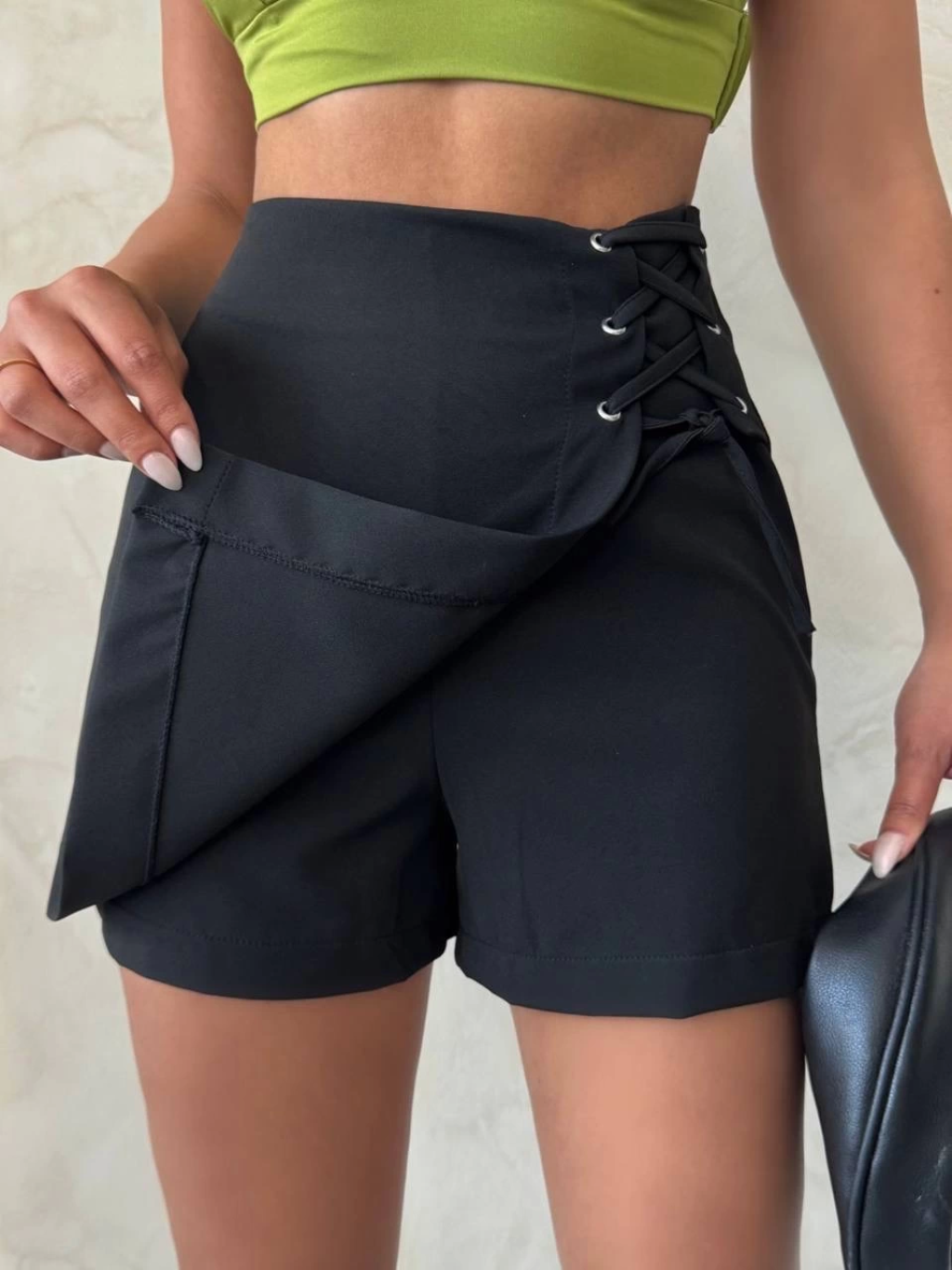 Yüksek bel parçalı double kumaş şort s25312