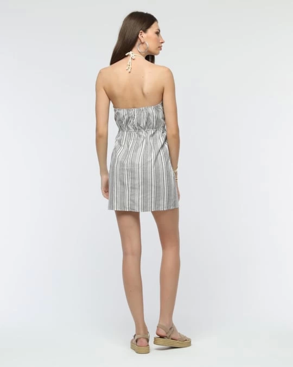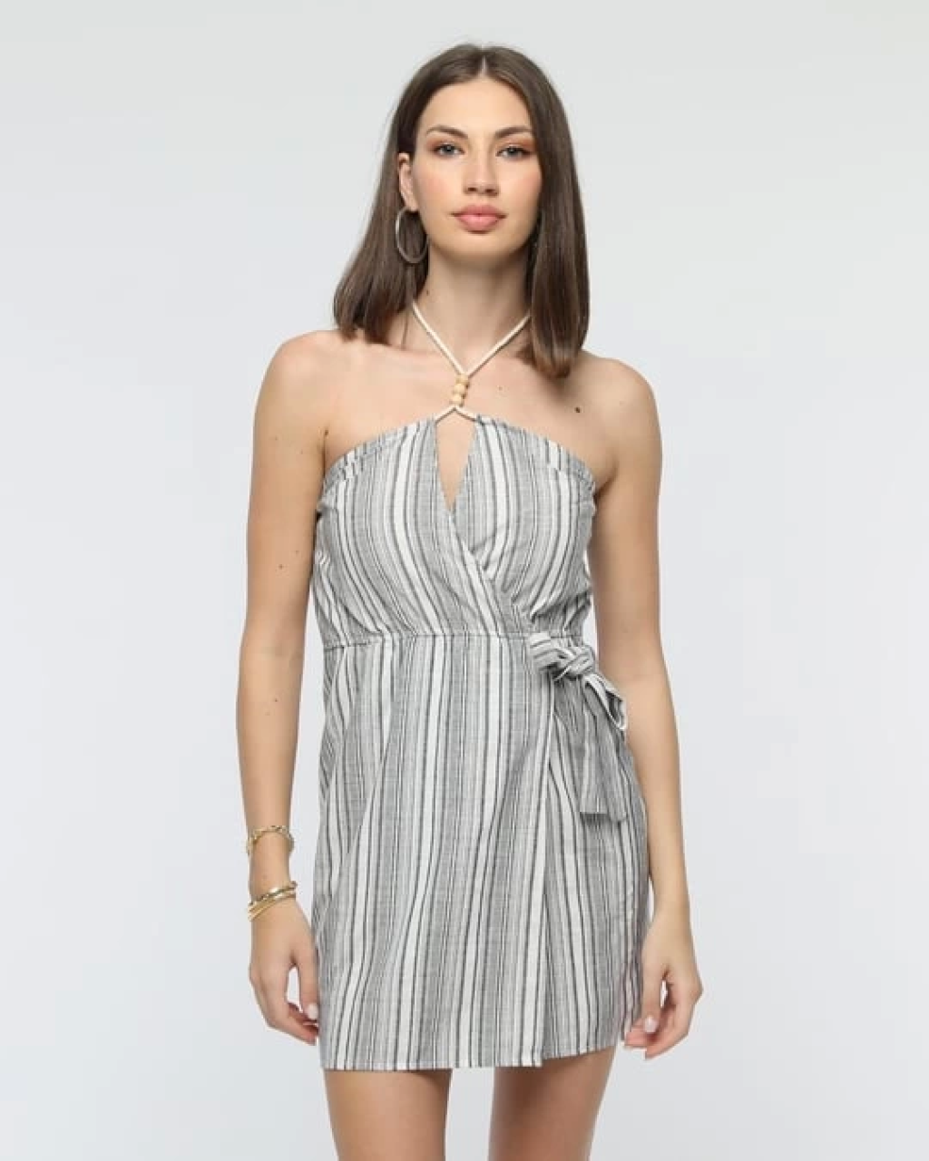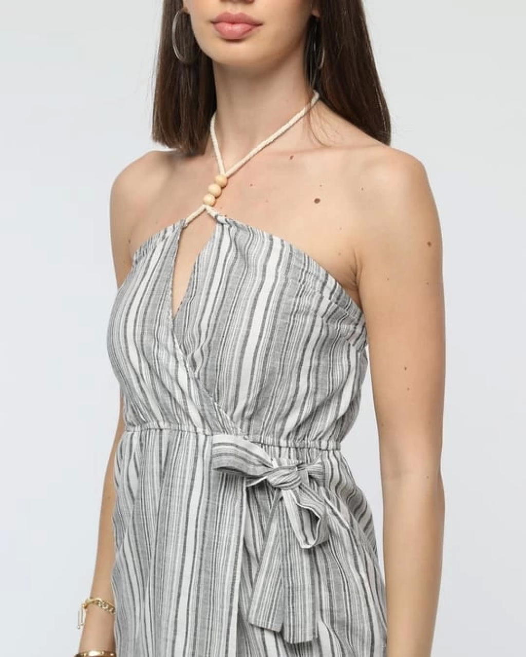 Madonna yaka midi yırtmaçlı kuşaklı keten elbise
