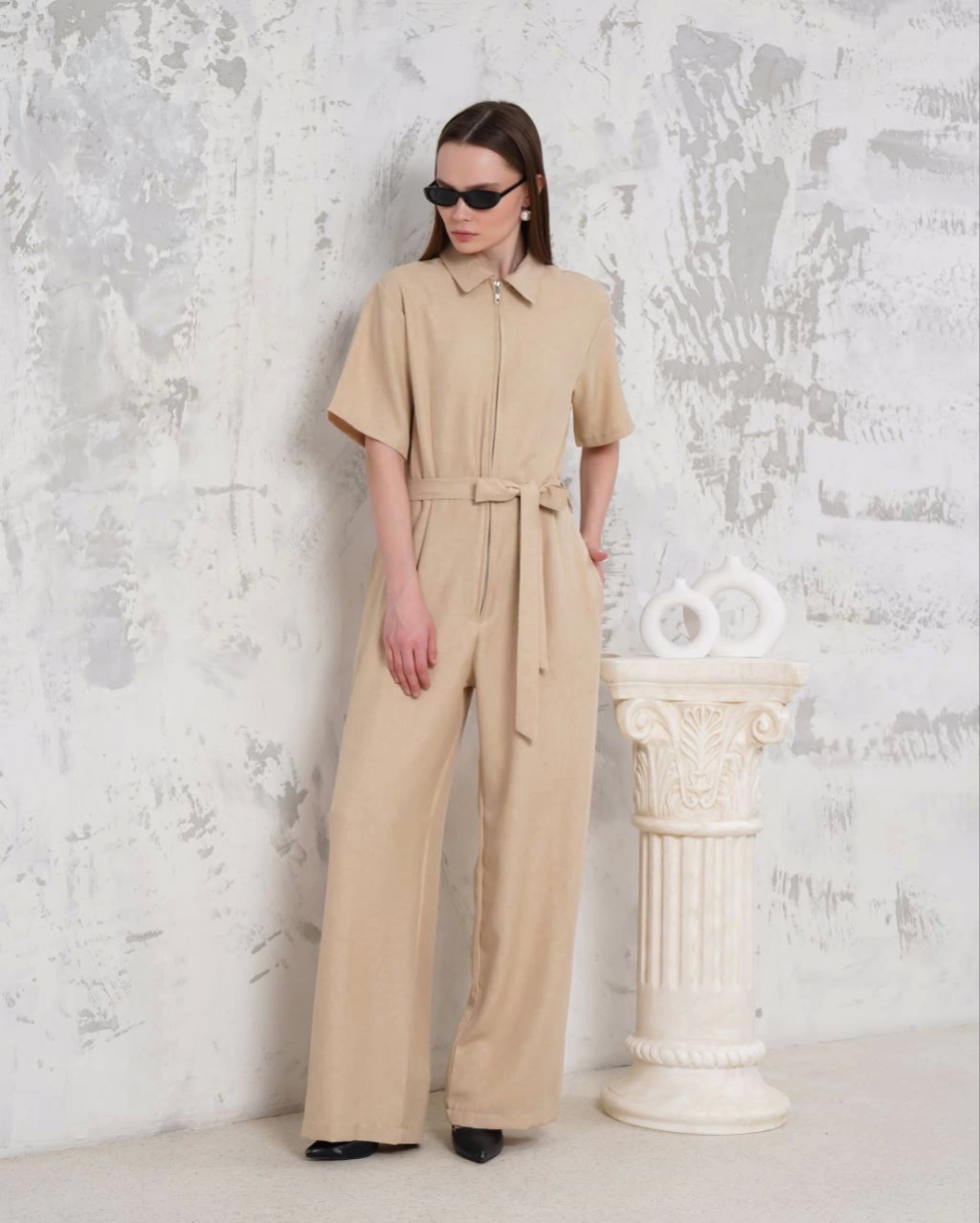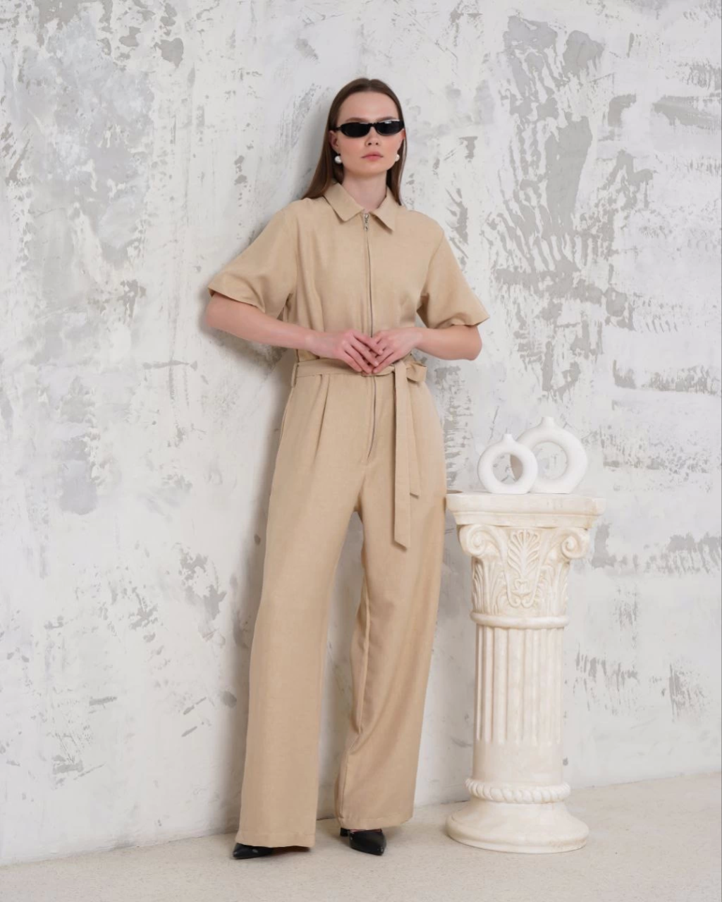 Kuşaklı gömlek yaka salaş tulum bej s255822