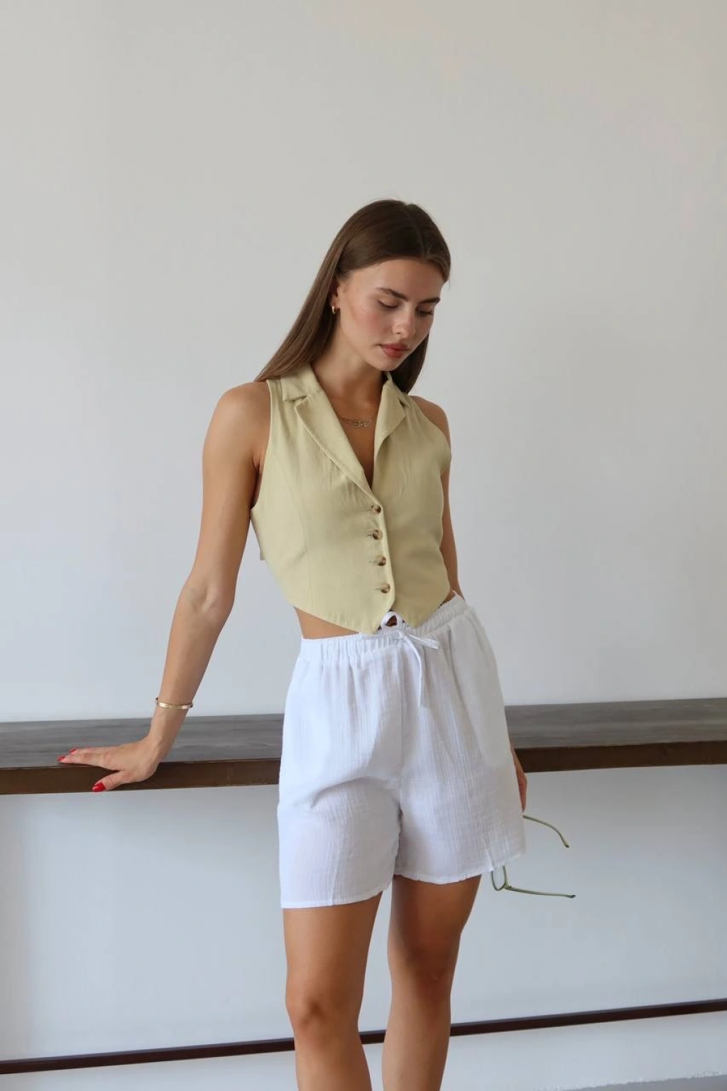 Müslin kumaş şort bağcıklı bej pt