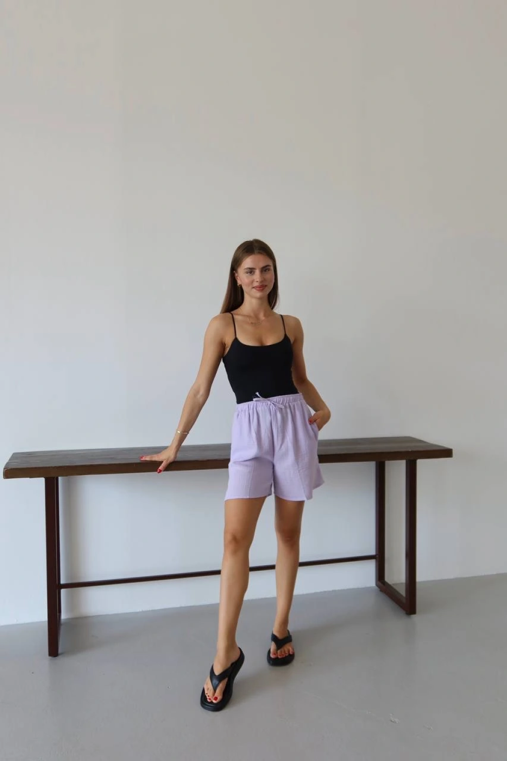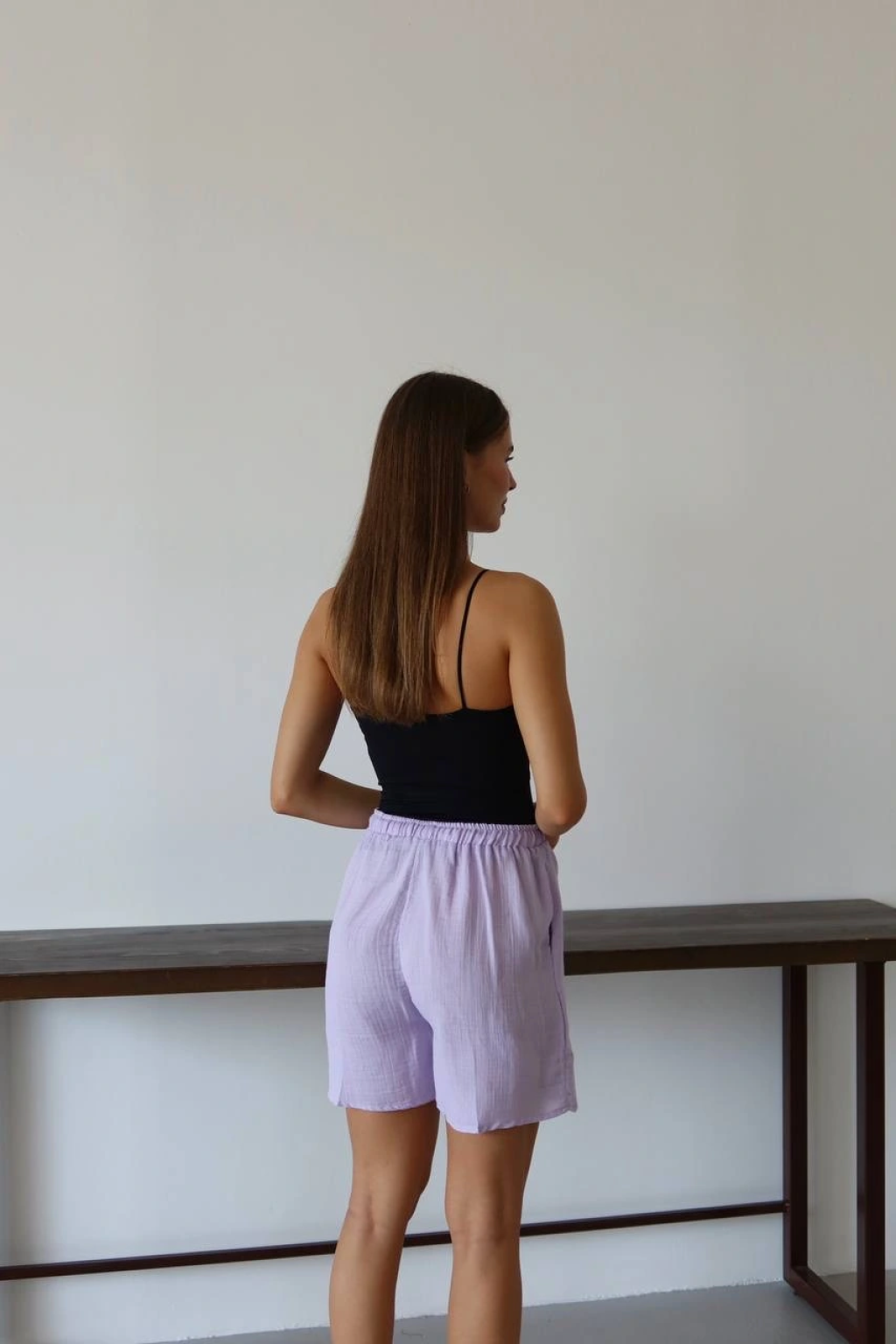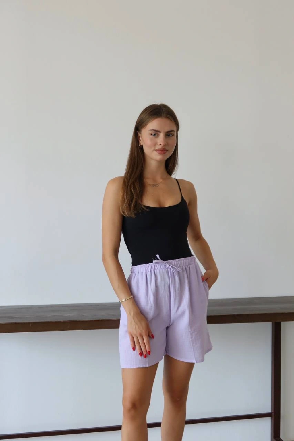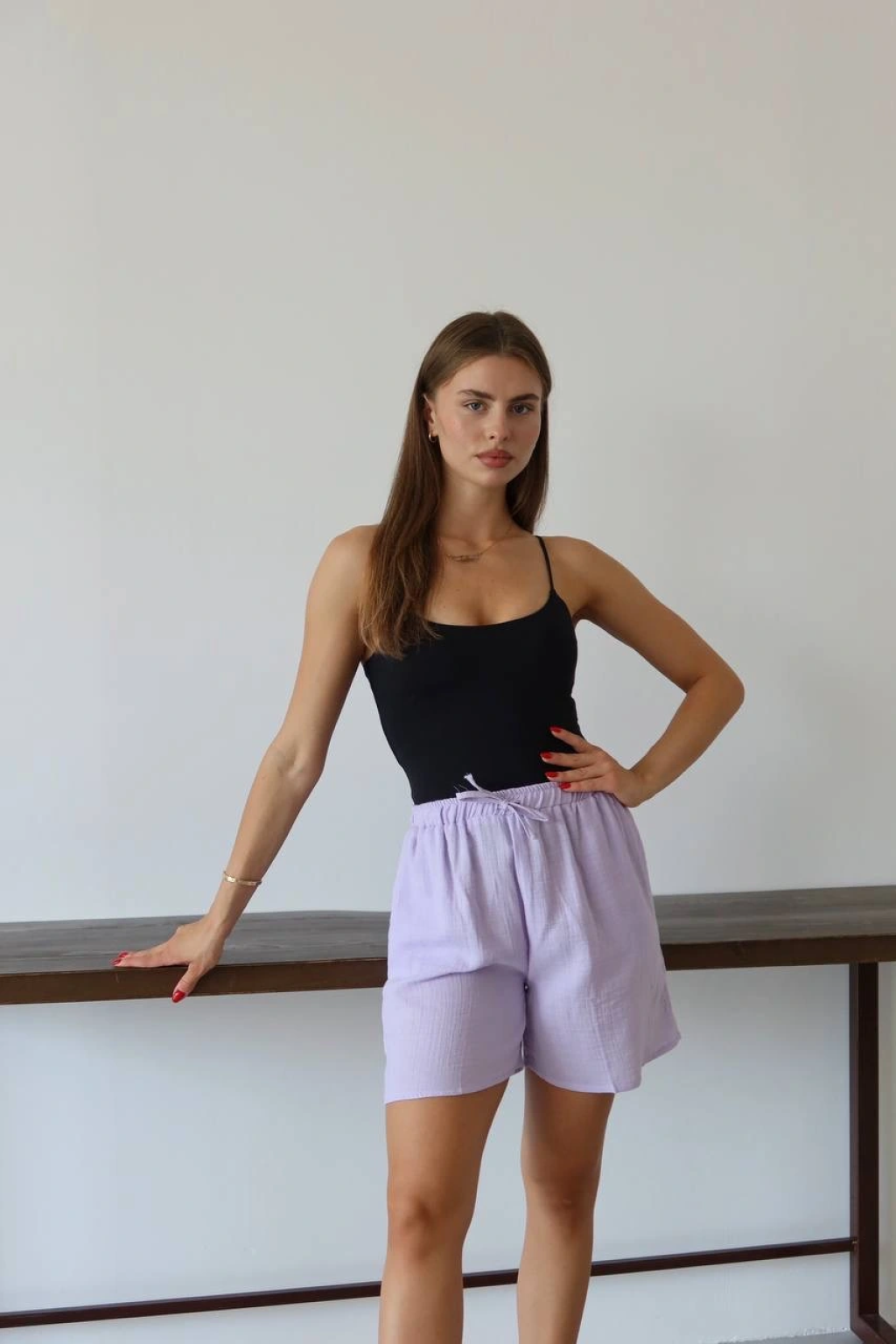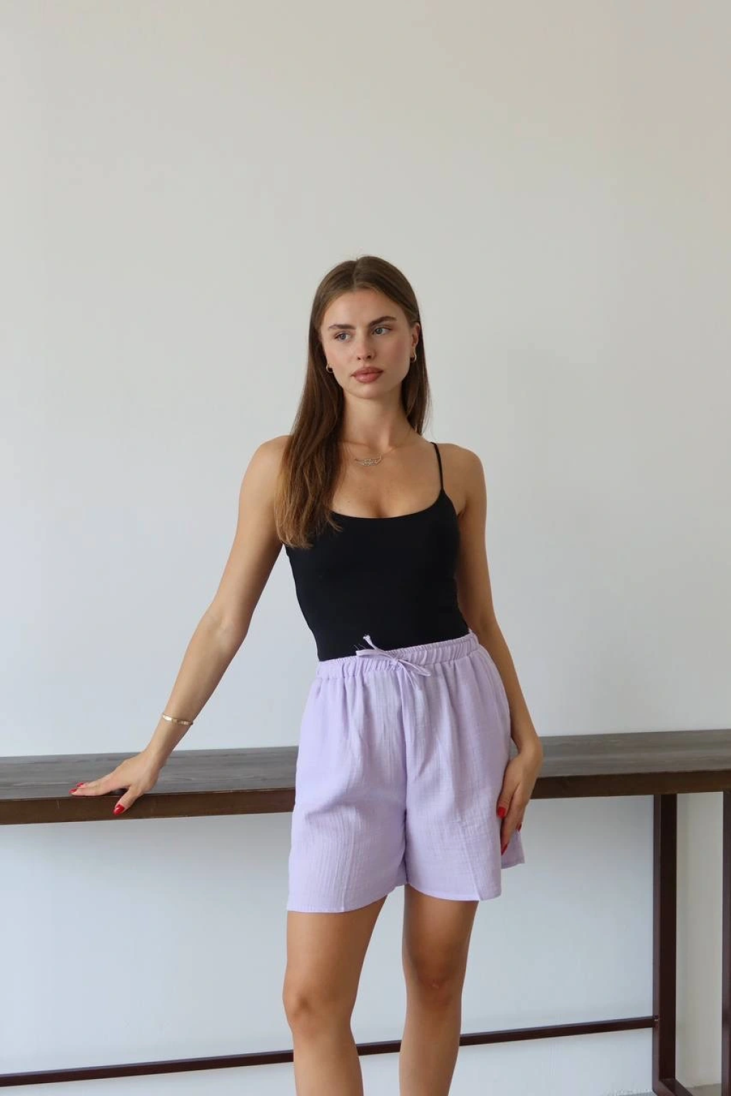 Müslin kumaş şort bağcıklı lila pt
