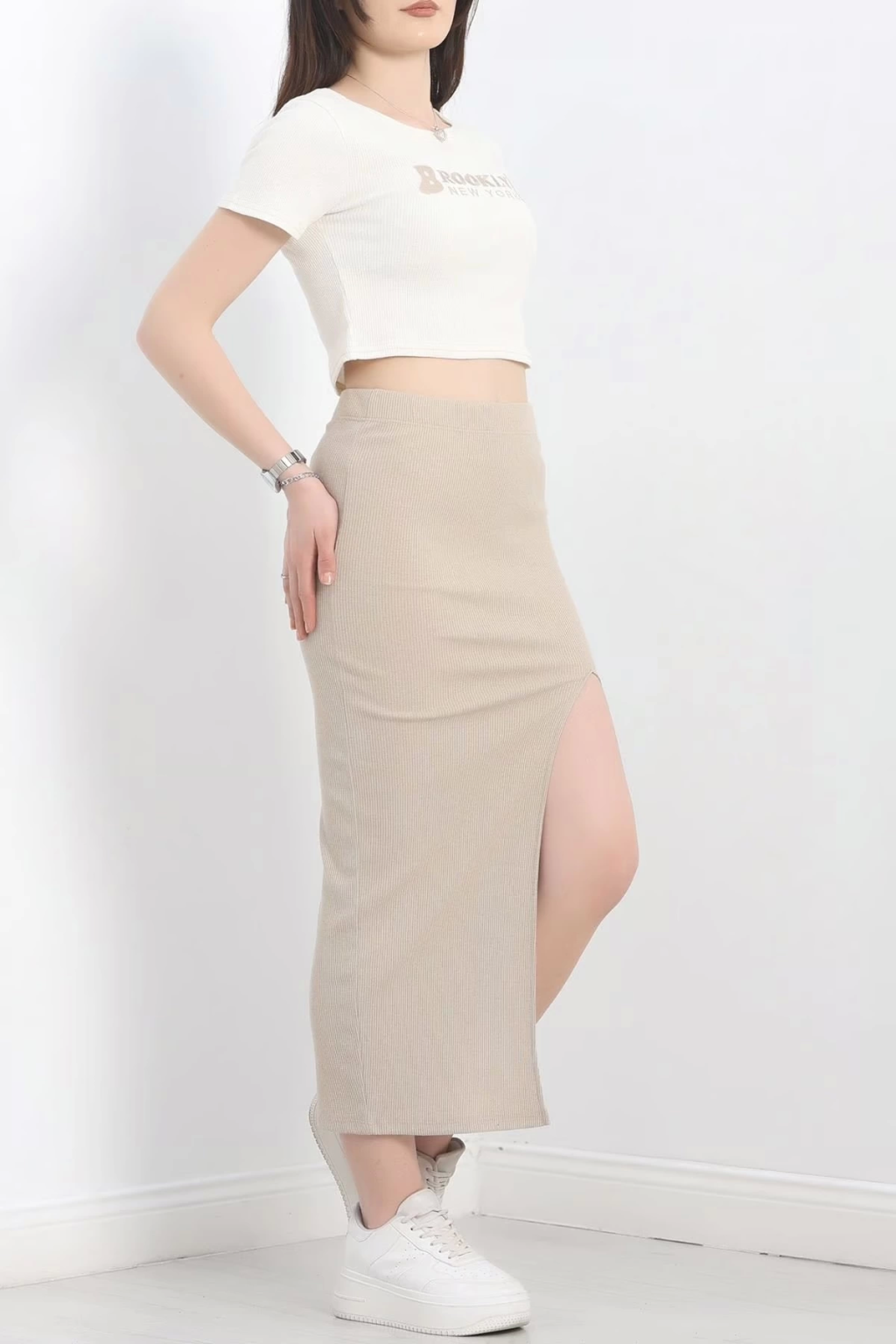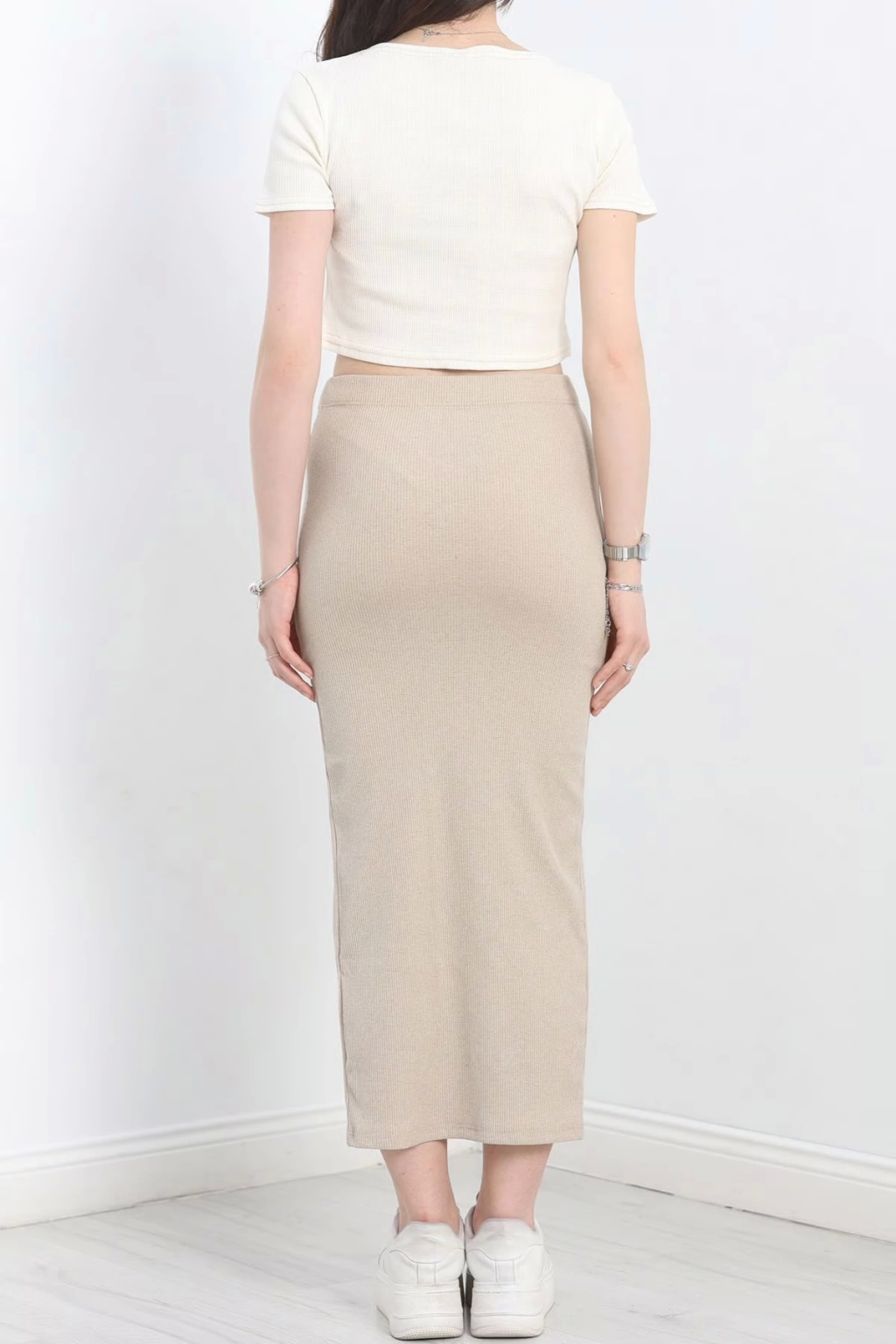 Uzun etekli bluz takım keten krem s255852
