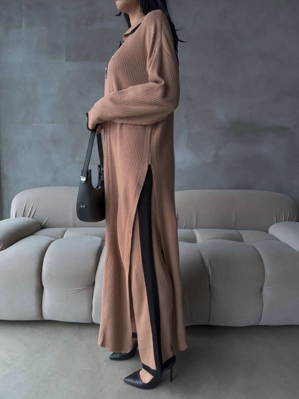 Pantolon yırtmaçlı elbise ikili triko takım vizon elf