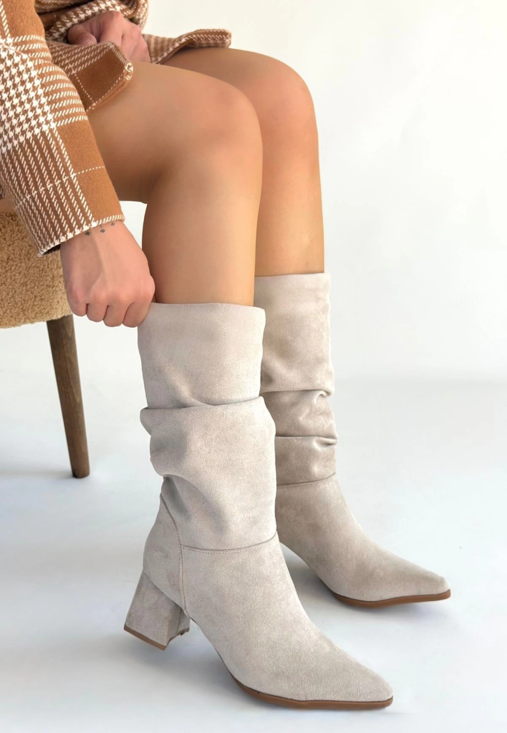 Titen Bej Süet Körüklü Topuklu Çizme