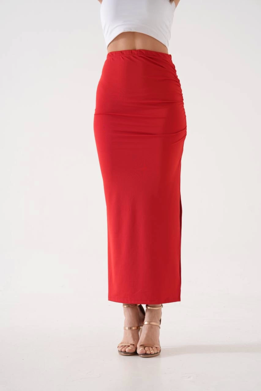 Uzun yırtmaçlı ince kumaş etek kırmızı