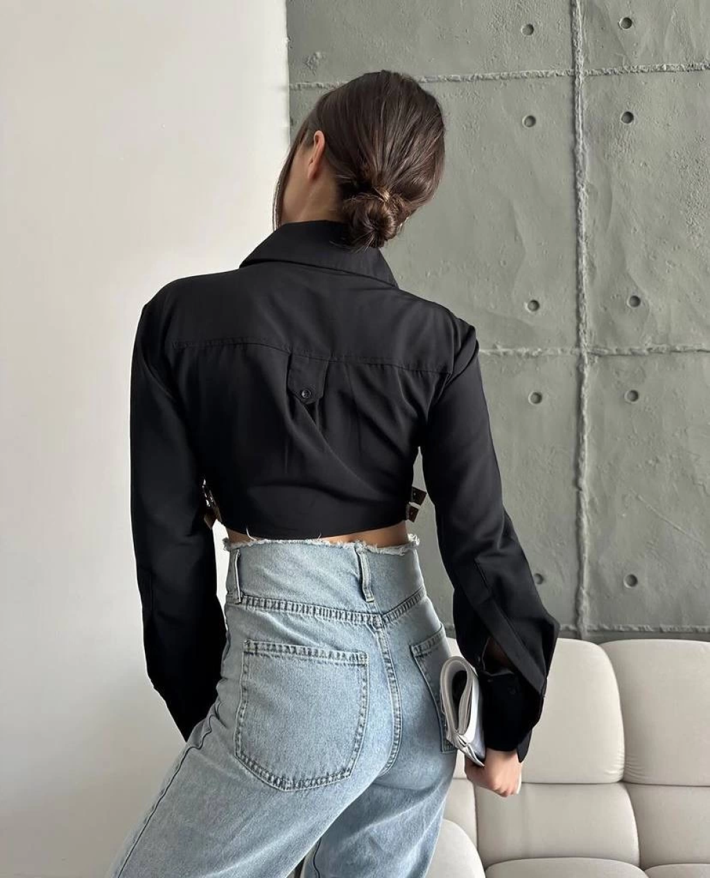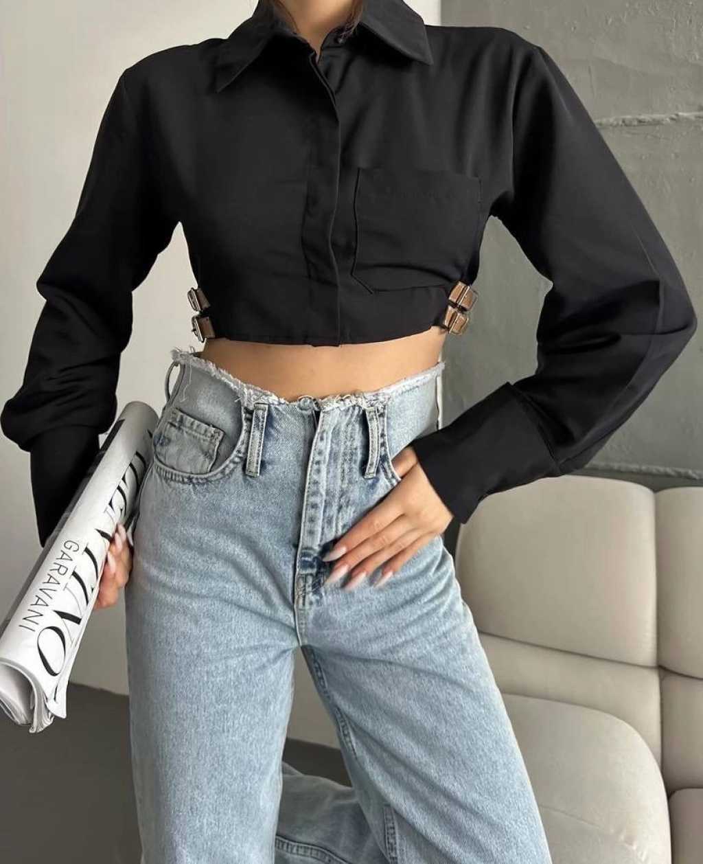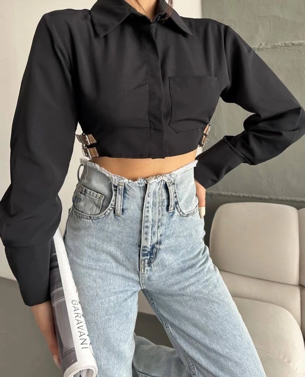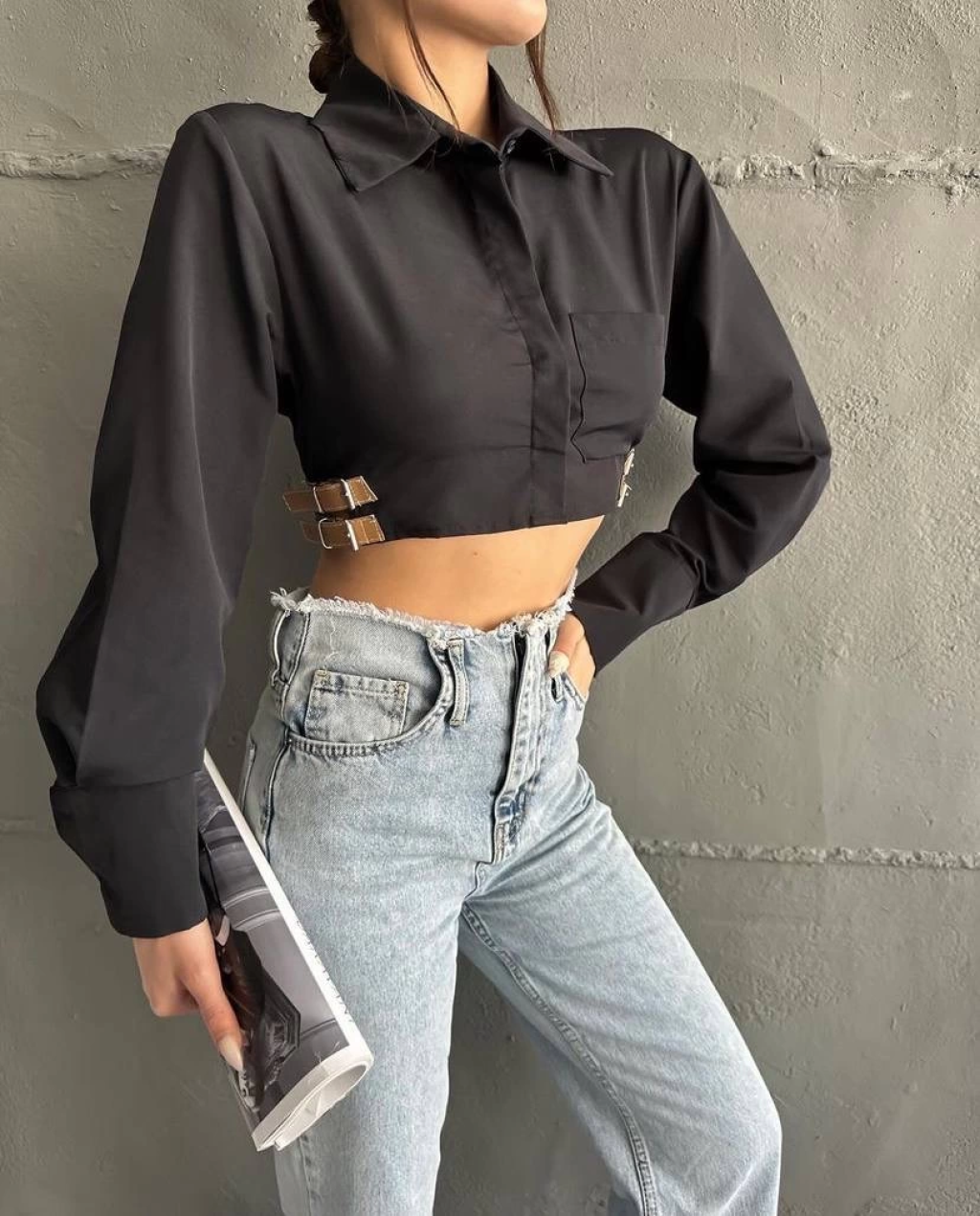 Yanı kemer detaylı crop gömlek siyah s4009
