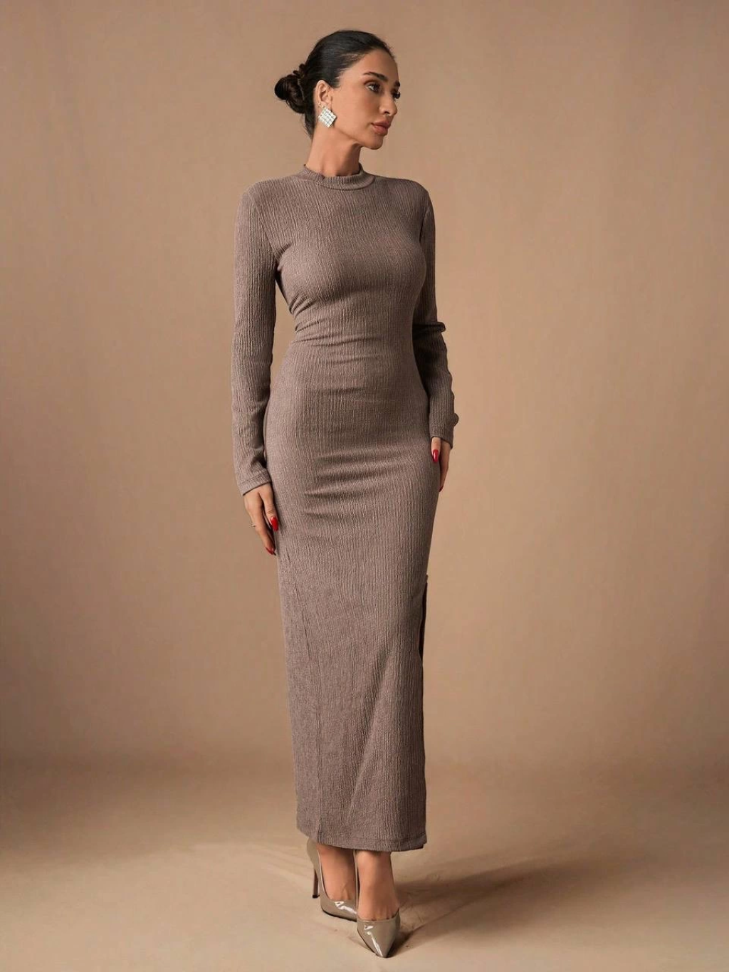 Yırtmaçlı kalın bürümcük uzun elbise vizon